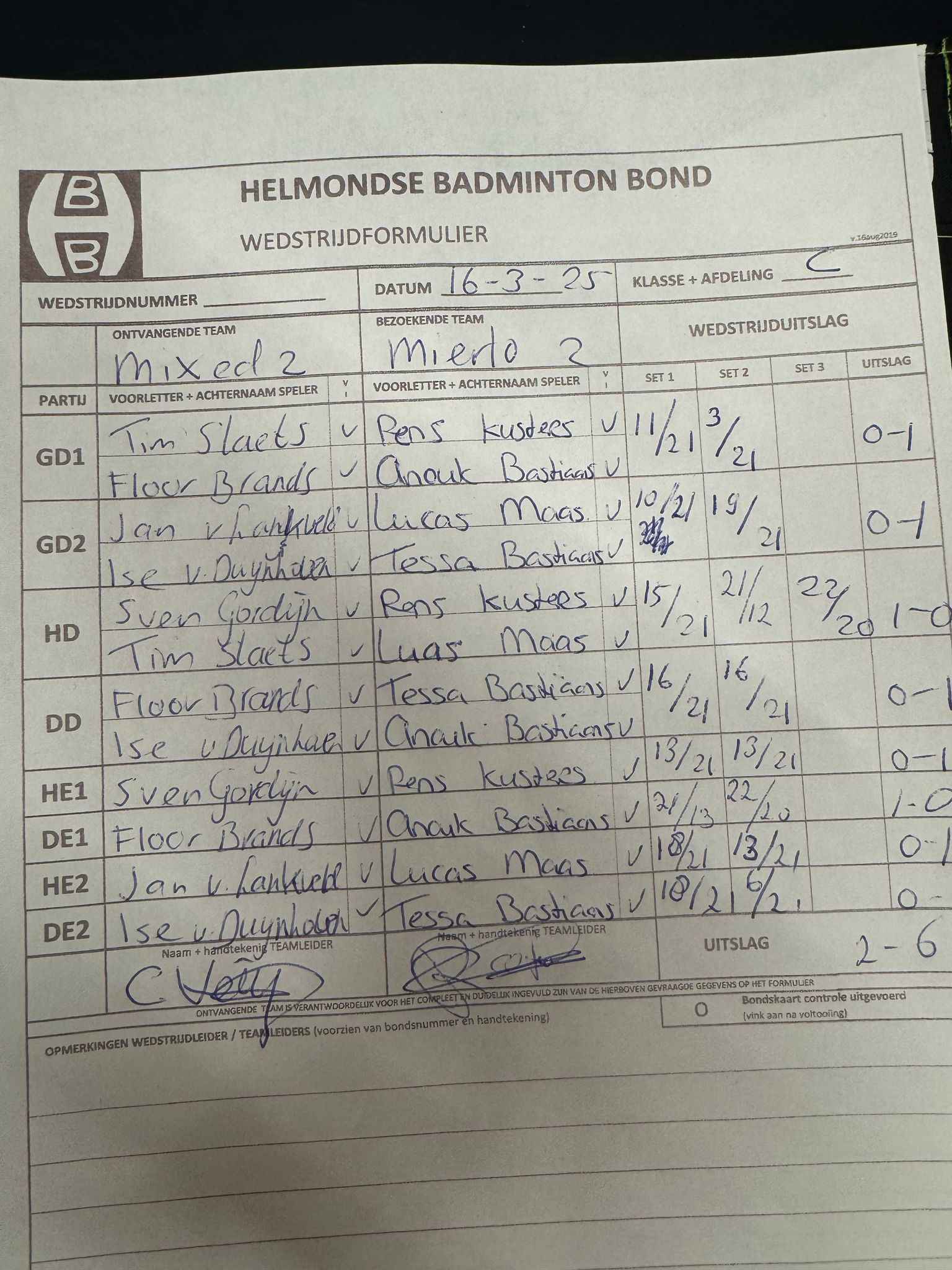 | 09:30 | zo. 16-03-2025 | Mixed 2 | - | Mierlo 2 | 1 | 2 - 6 | ||