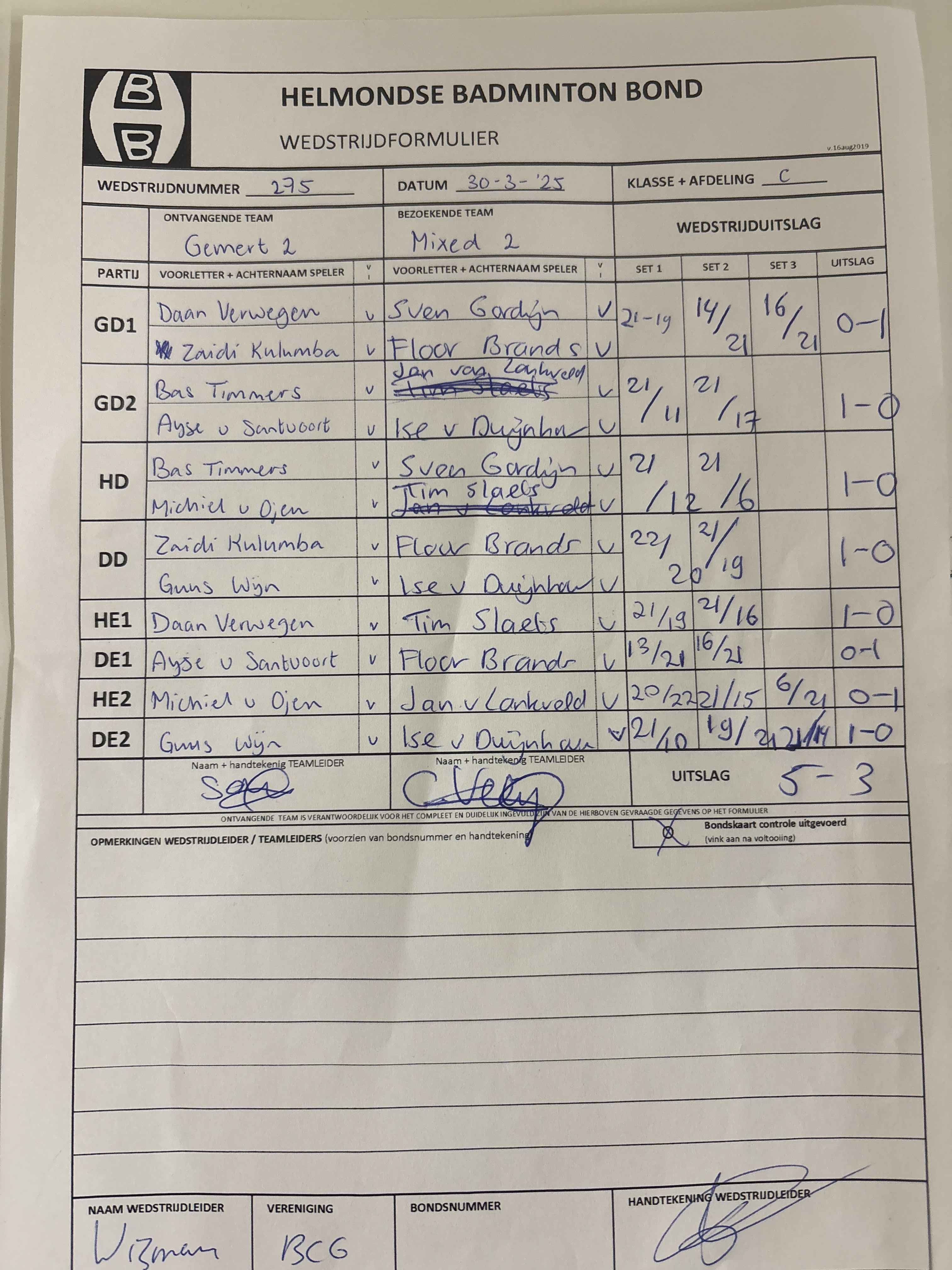 | 09:30 | zo. 30-03-2025 | Gemert 2 | - | Mixed 2 | 11 | 5 - 3 |