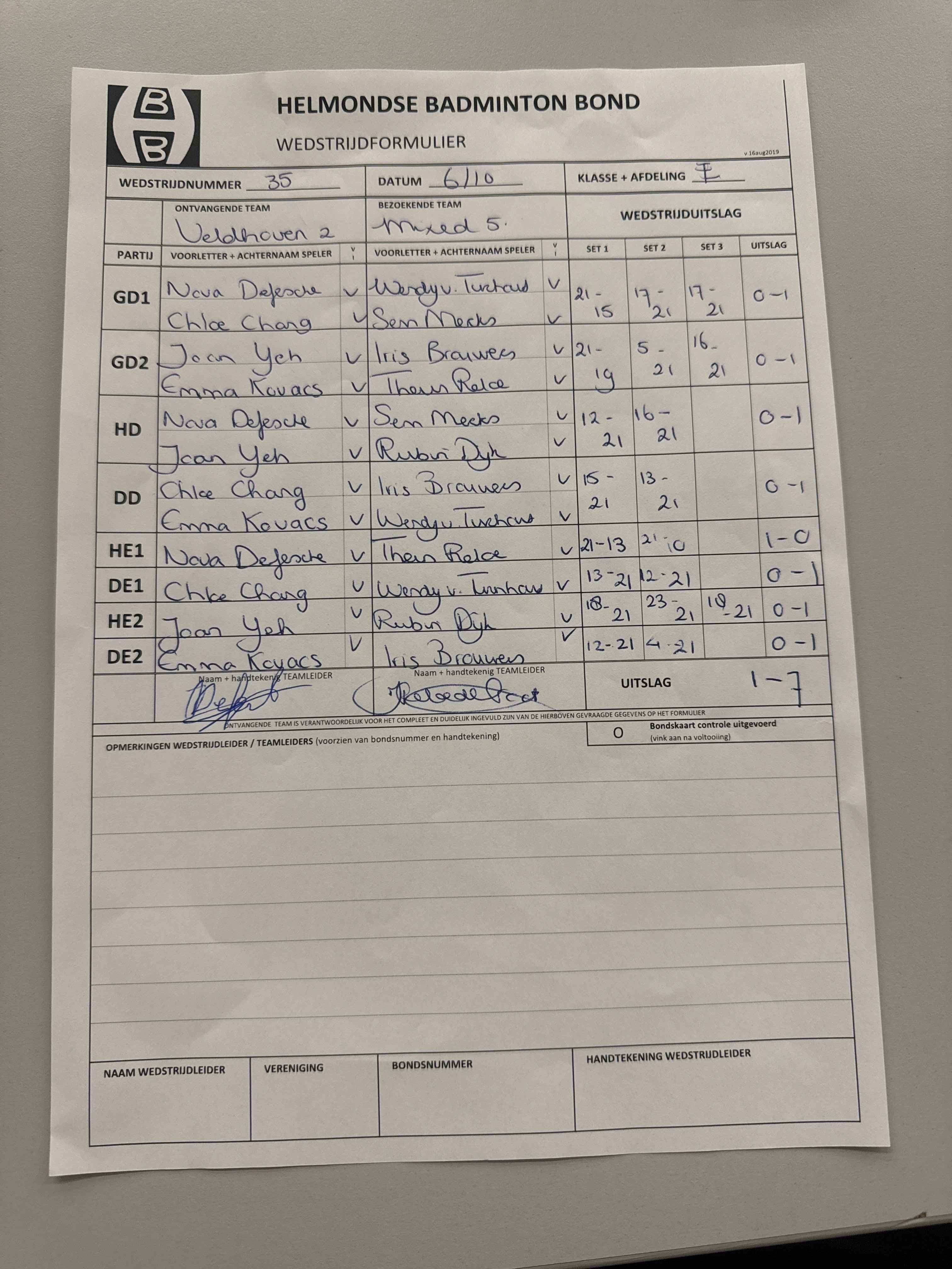 | 09:30 | zo. 06-10-2024 | Veldhoven 2 | - | Mixed 5 | 2 | 1 - 7 | ||
