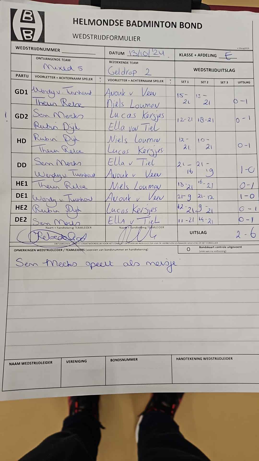 | 12:30 | zo. 13-10-2024 | Mixed 5 | - | Geldrop 2 | 15 | 2 - 6 | ||