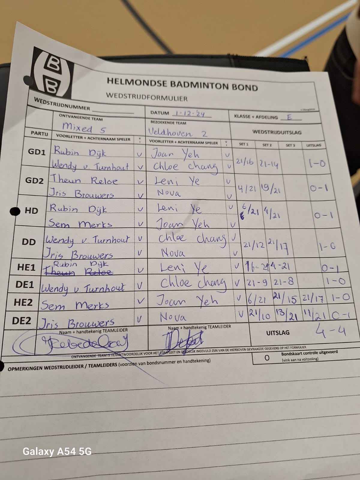 | 09:30 | zo. 01-12-2024 | Mixed 5 | - | Veldhoven 2 | 5 | 4 - 4 | ||