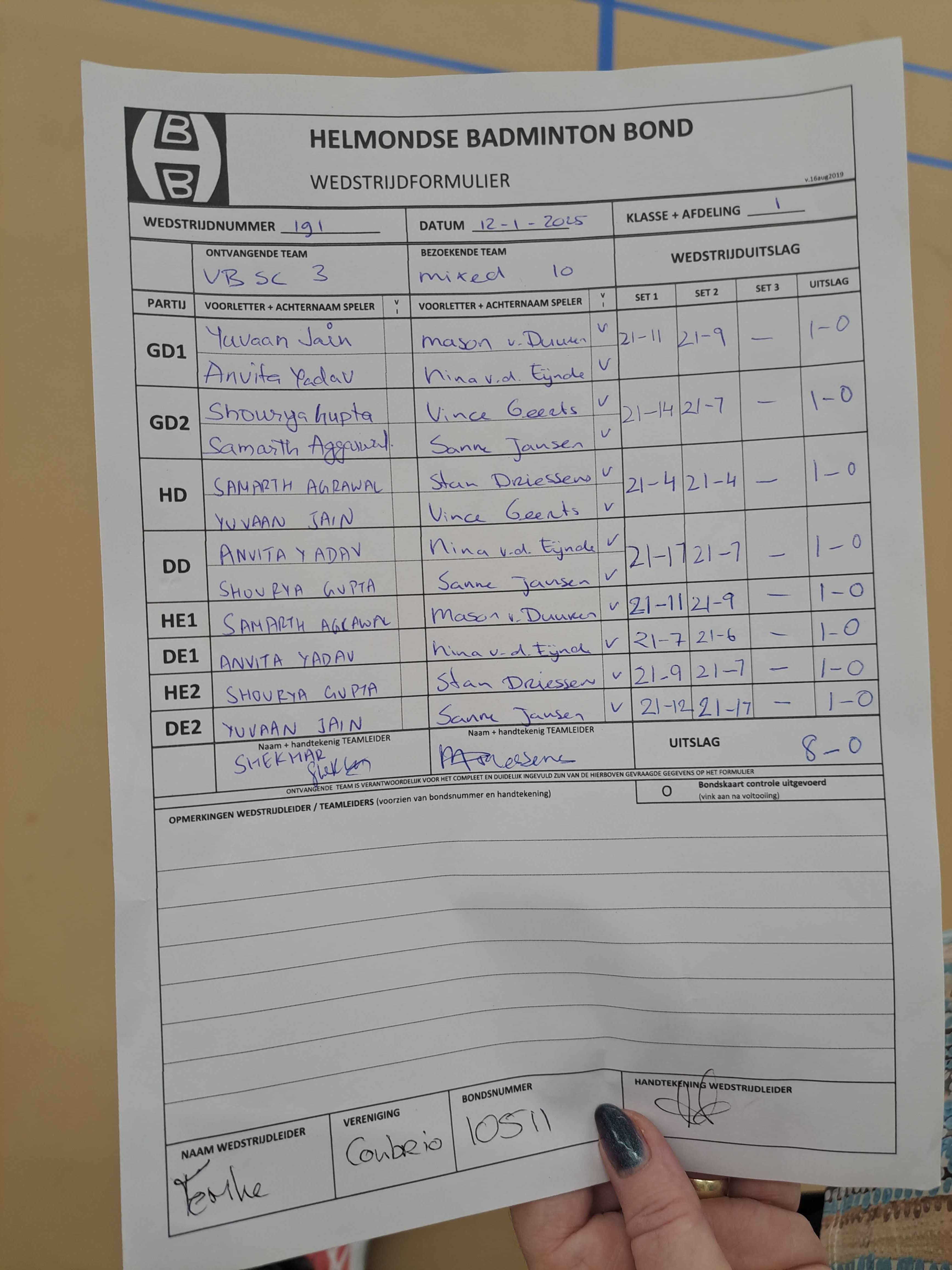 | 09:30 | zo. 12-01-2025 | VBSC 3 | - | Mixed 10 | 3 | 8 - 0 | ||