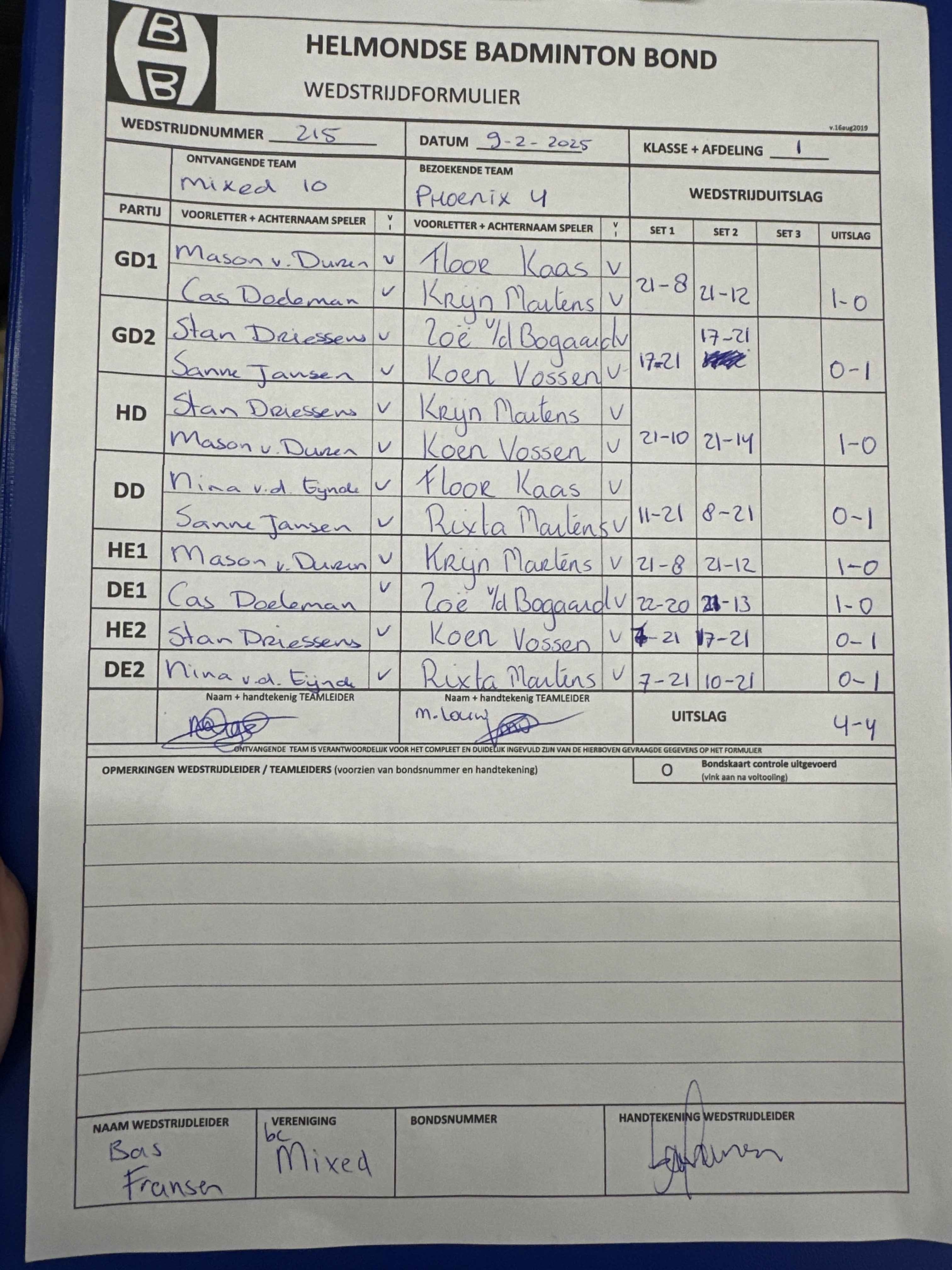 | 09:30 | zo. 02-02-2025 | Mixed 10 | - | Mixed 9 | 11 | 4 - 4 | ||