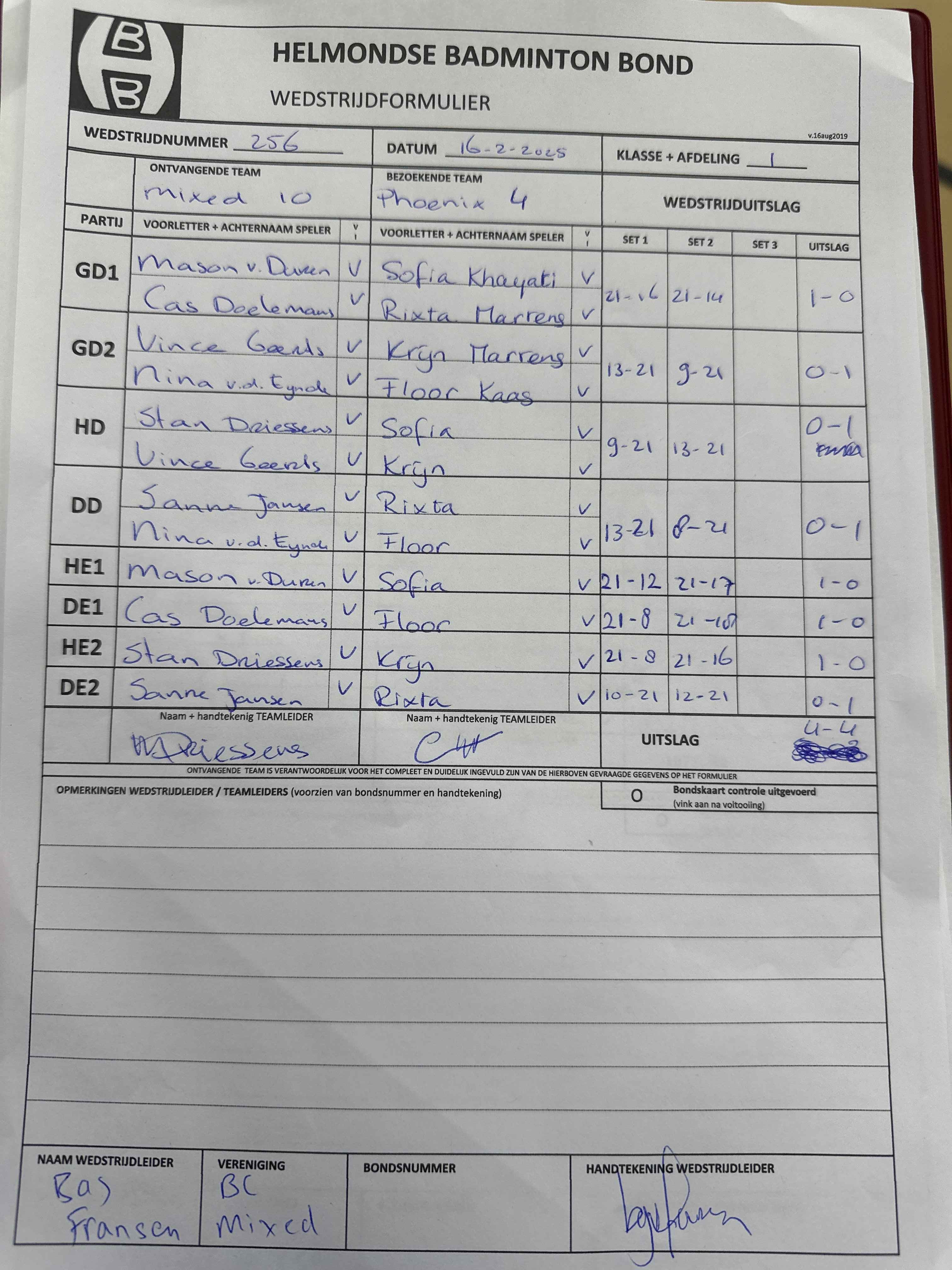 | 09:30 | zo. 16-02-2025 | Mixed 10 | - | Phoenix 4 | 13 | 4 - 4 | ||