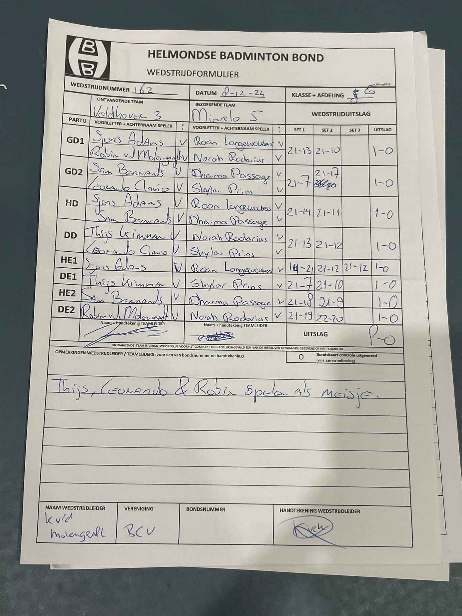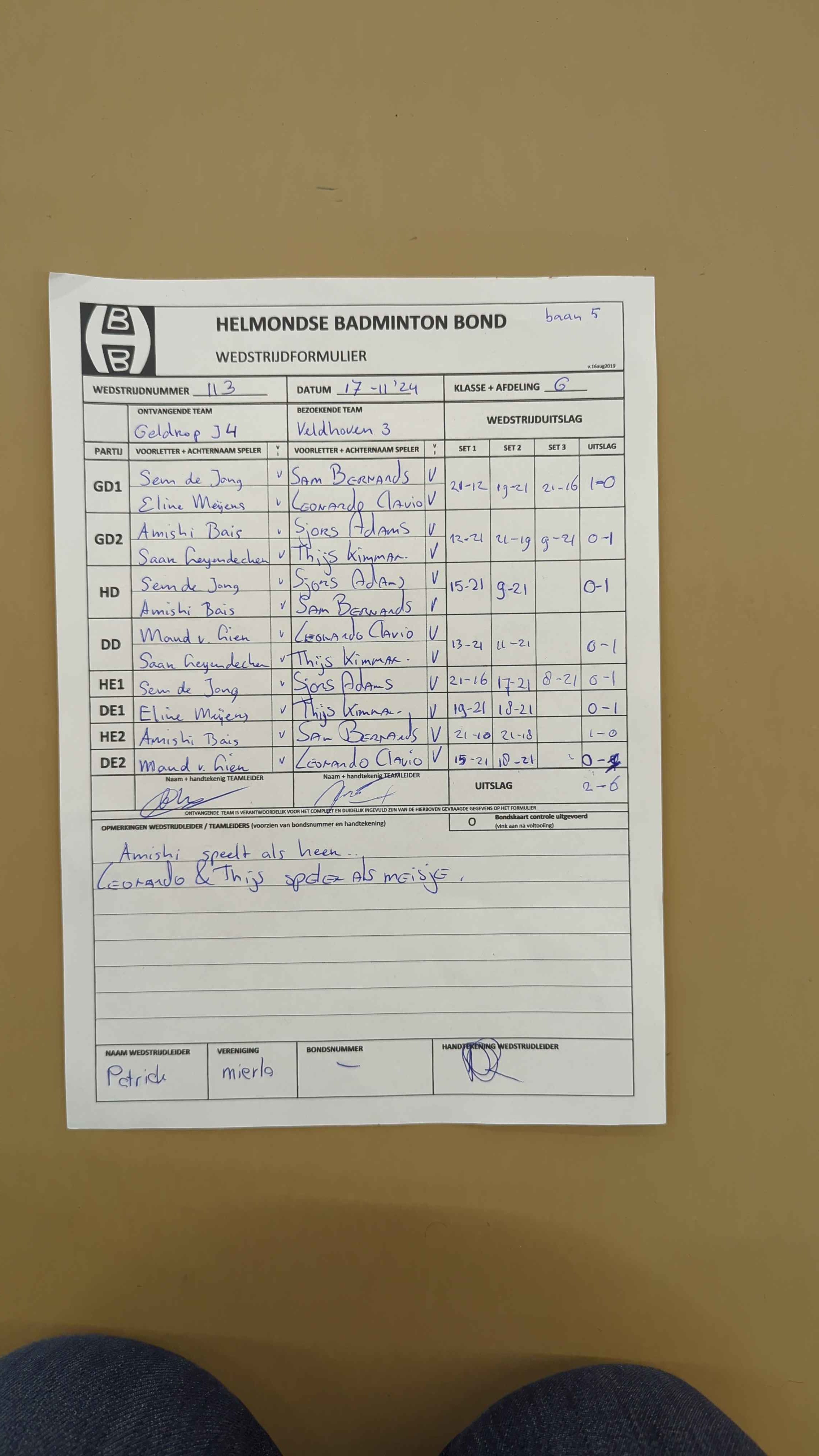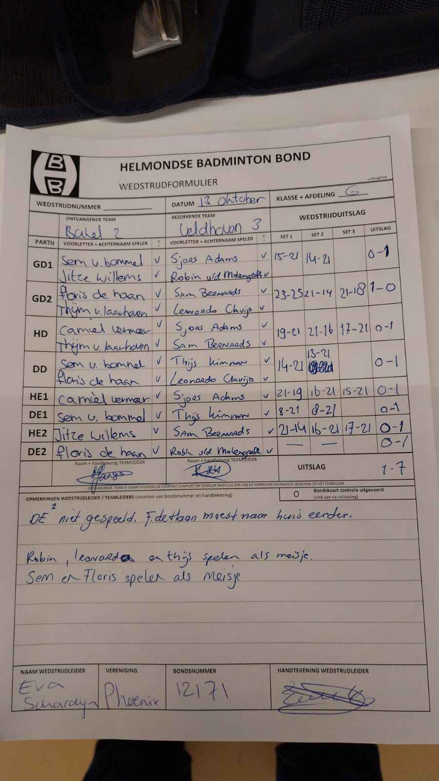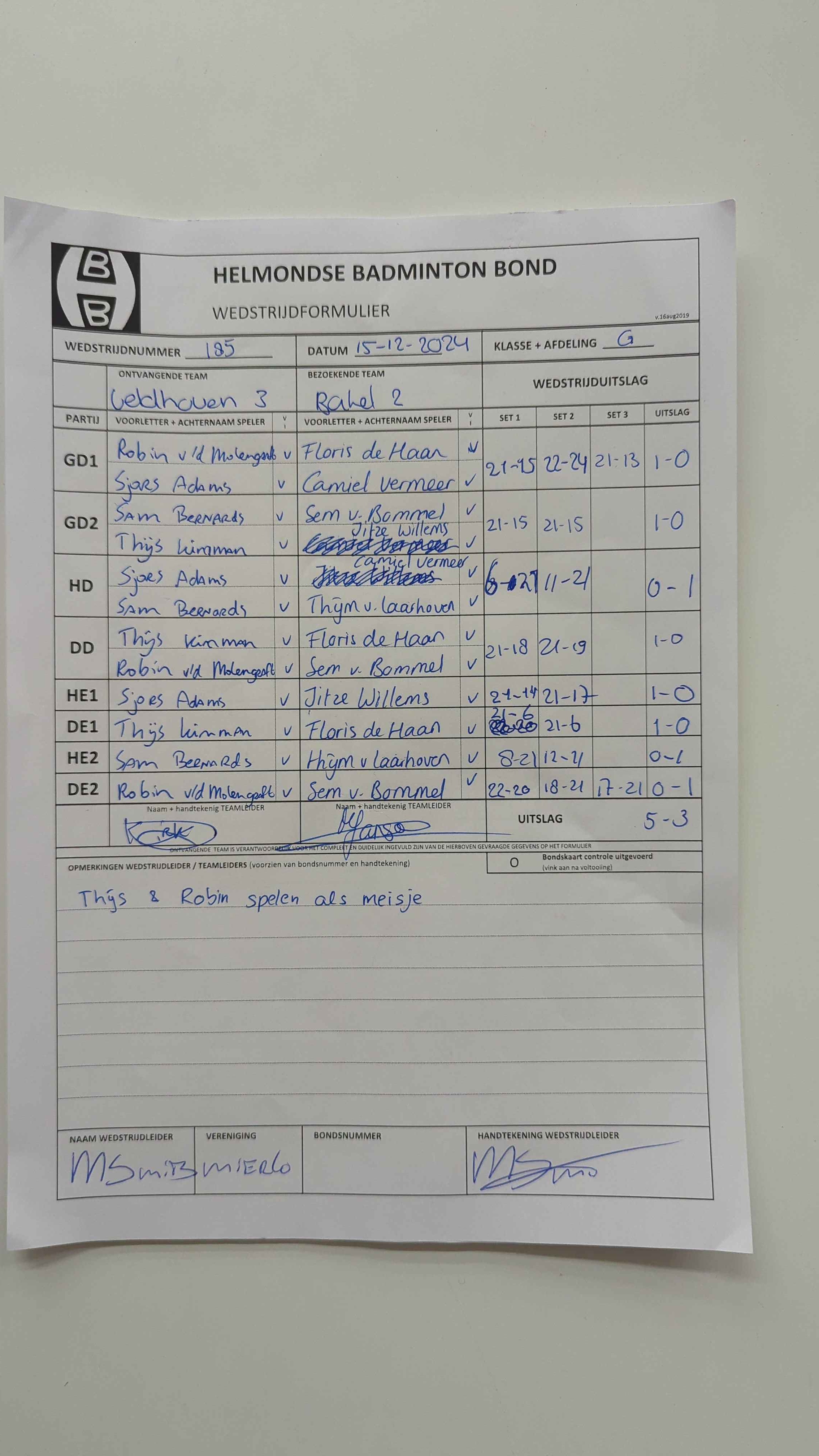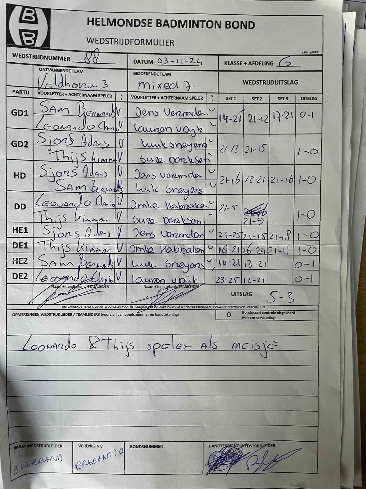| 12:30 | zo. 03-11-2024 | Veldhoven 3 | - | Mixed 7 | 13 | 5 - 3 | ||