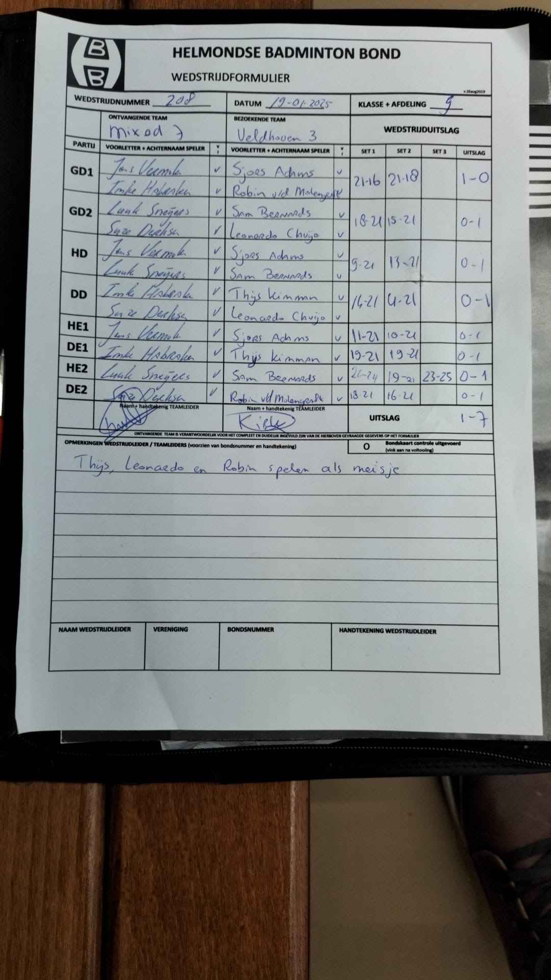 | 09:30 | zo. 19-01-2025 | Mixed 7 | - | Veldhoven 3 | 15 | 1 - 7 | ||