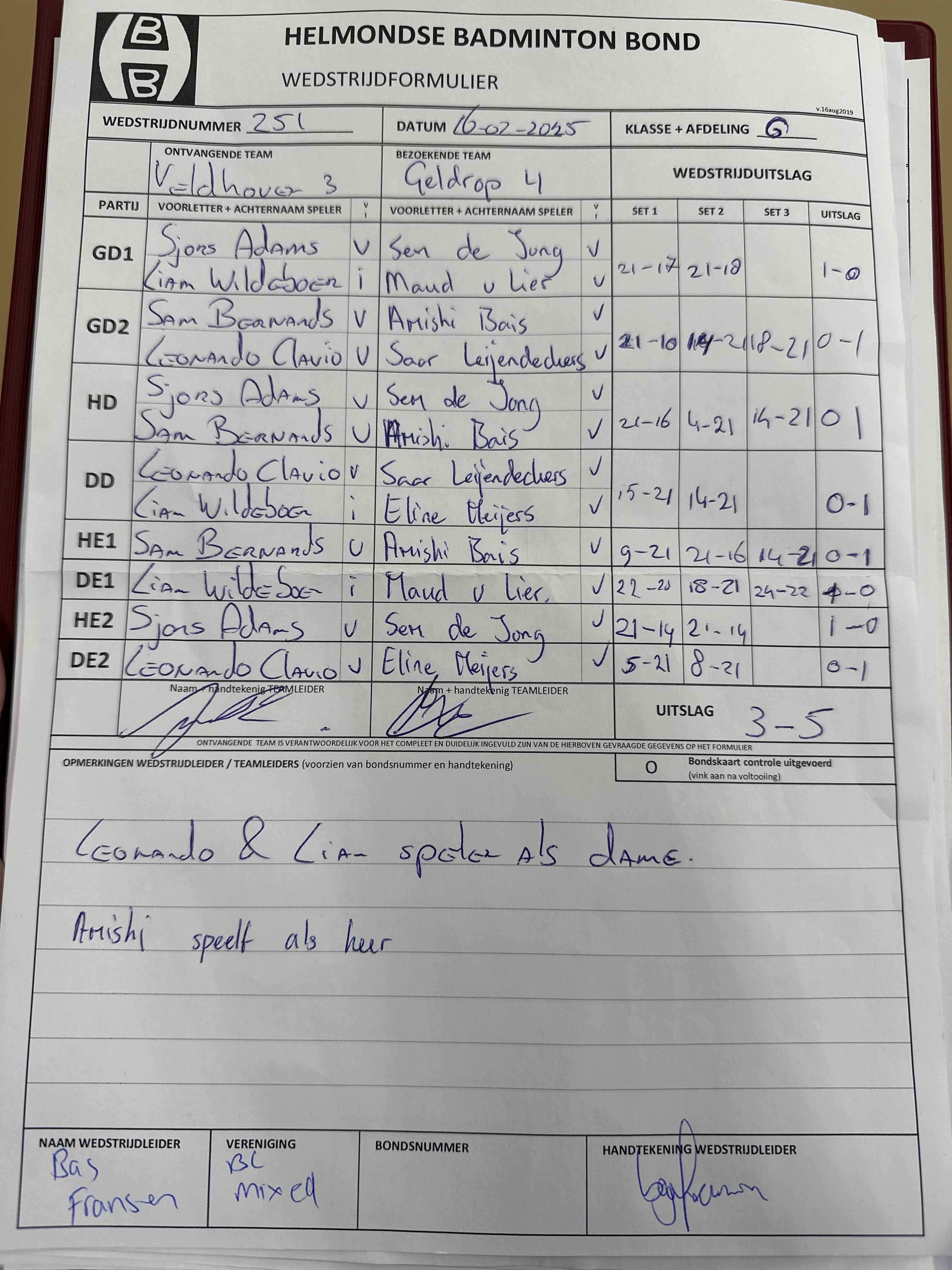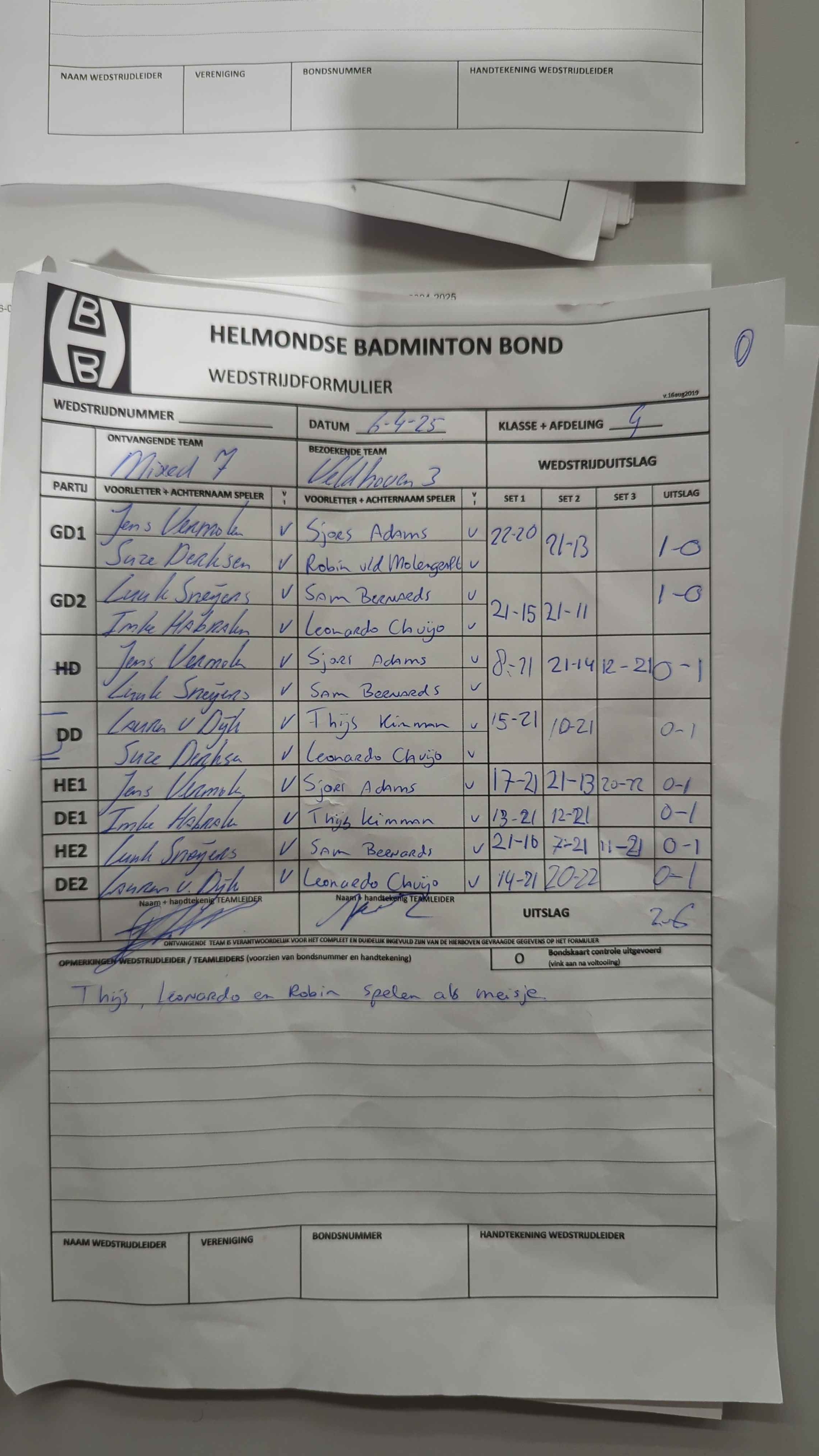 | 09:30 | zo. 06-04-2025 | Mixed 7 | - | Veldhoven 3 | 4 | 2 - 6 |