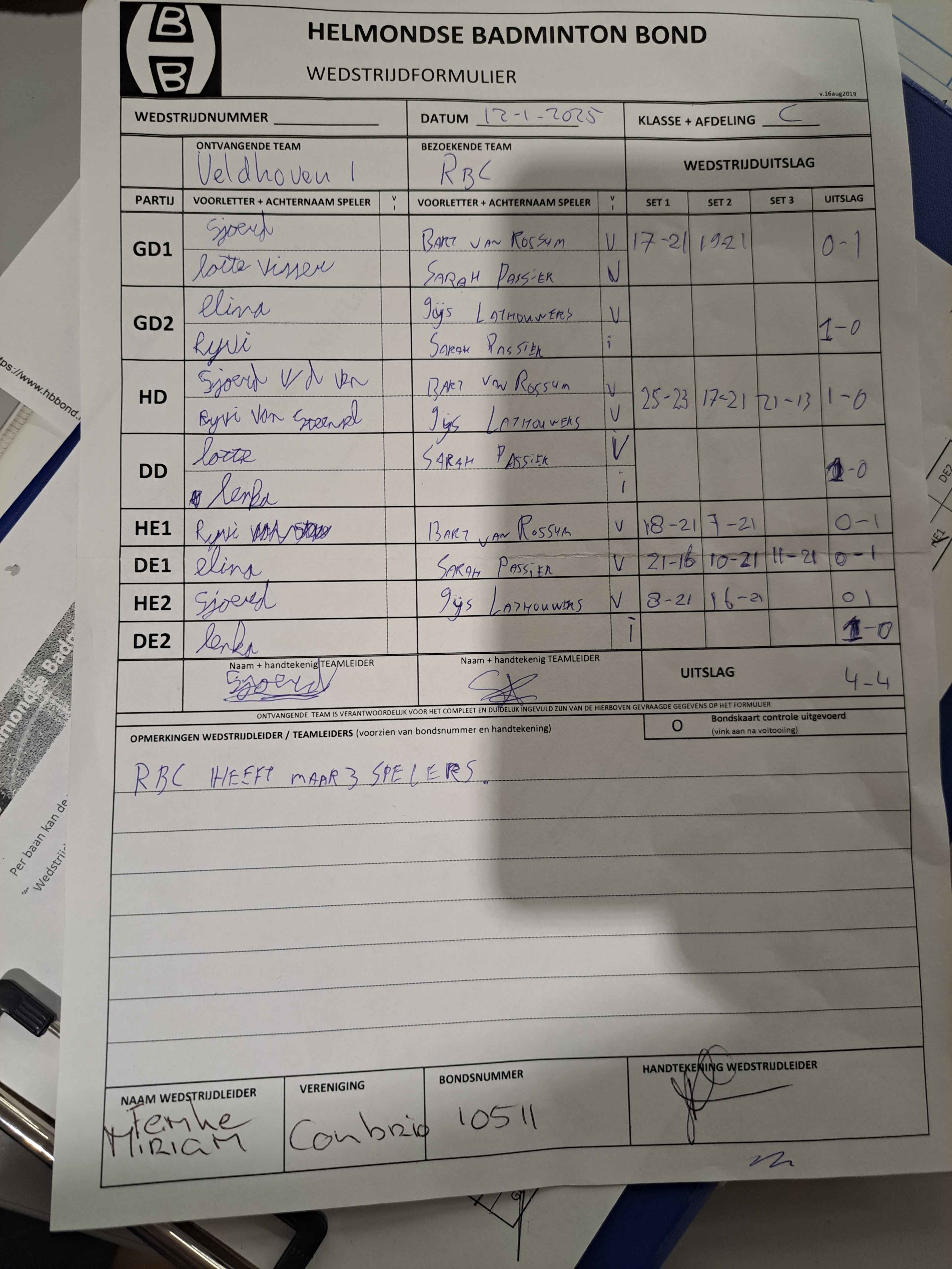 | 09:30 | zo. 12-01-2025 | Veldhoven 1 | - | RBC 1 | 15 | 4 - 4 | ||
