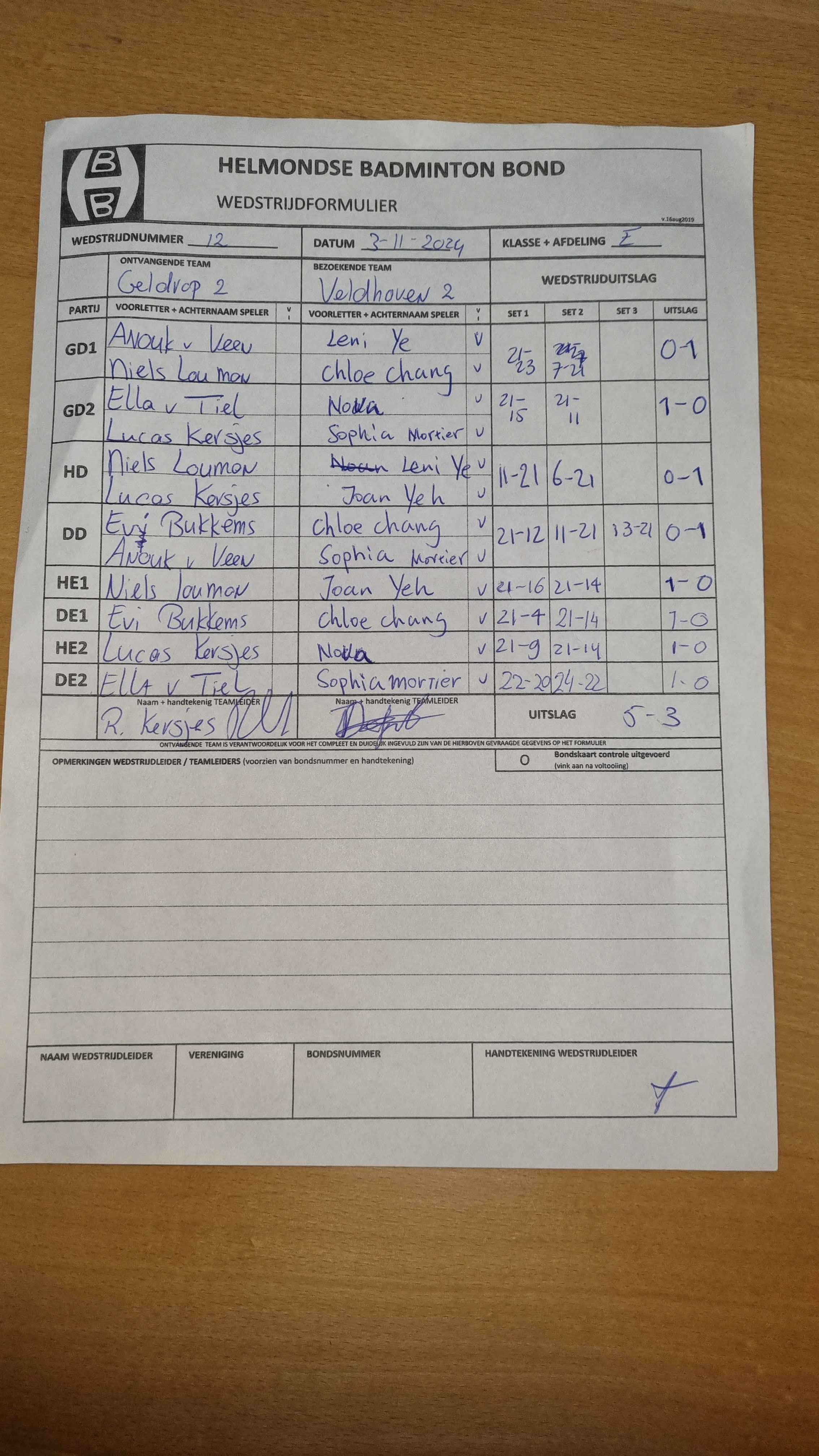 | 09:30 | zo. 01-12-2024 | Mixed 5 | - | Veldhoven 2 | 5 | 4 - 4 | ||