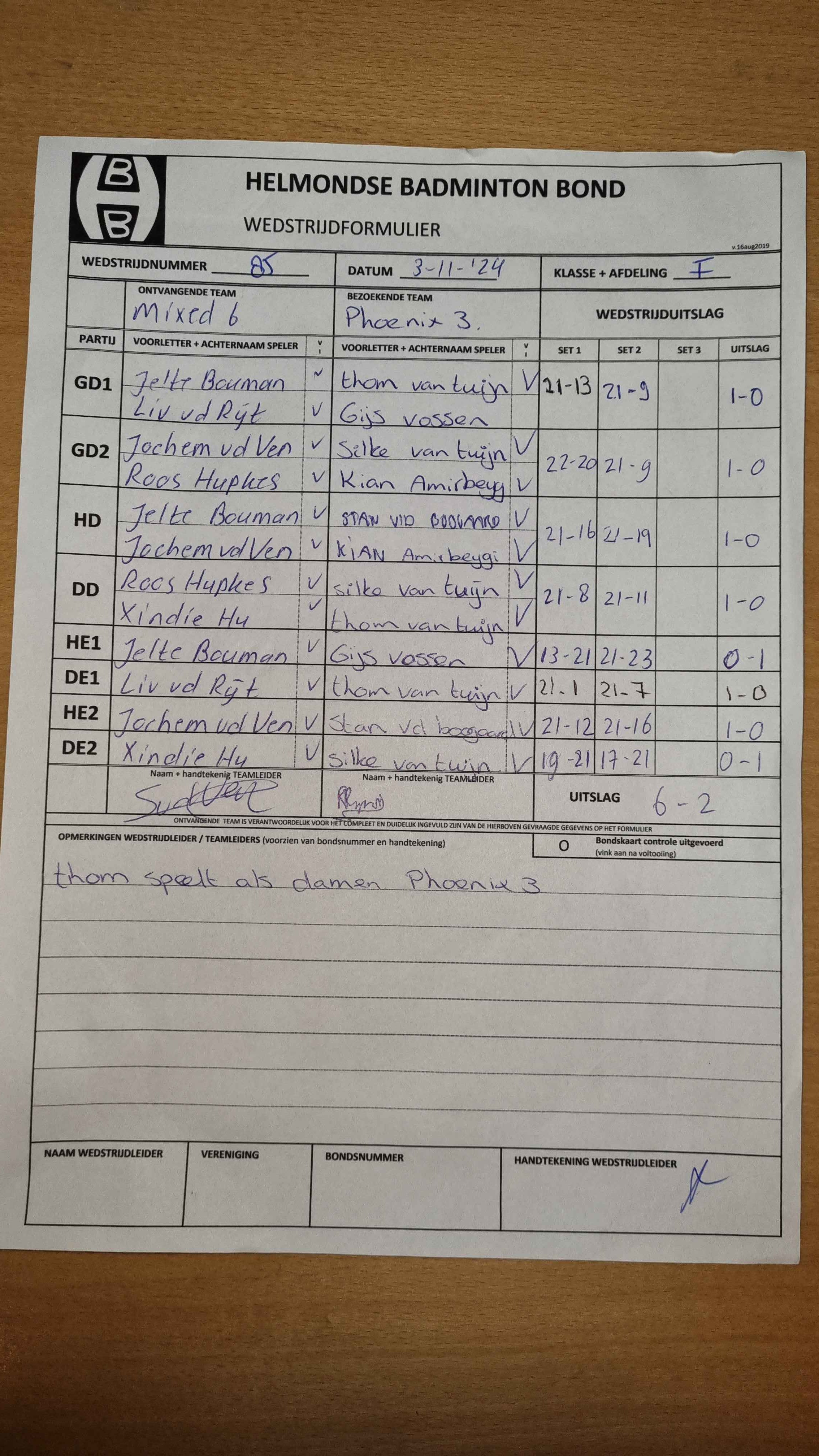 | 09:30 | zo. 03-11-2024 | Mixed 6 | - | Phoenix 3 | 12 | 6 - 2 | ||