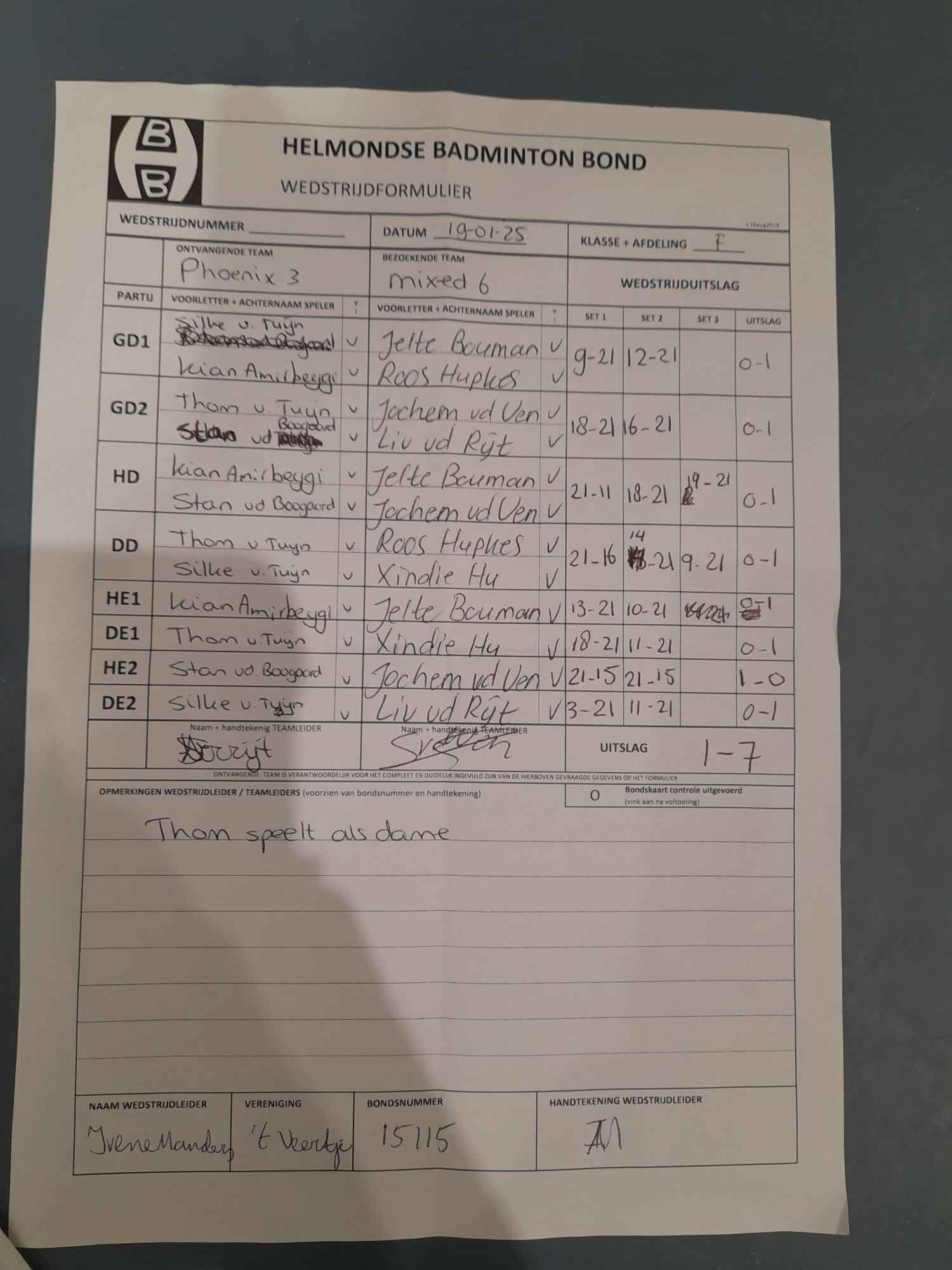| 09:30 | zo. 19-01-2025 | Phoenix 3 | - | Mixed 6 | 12 | 1 - 7 | ||