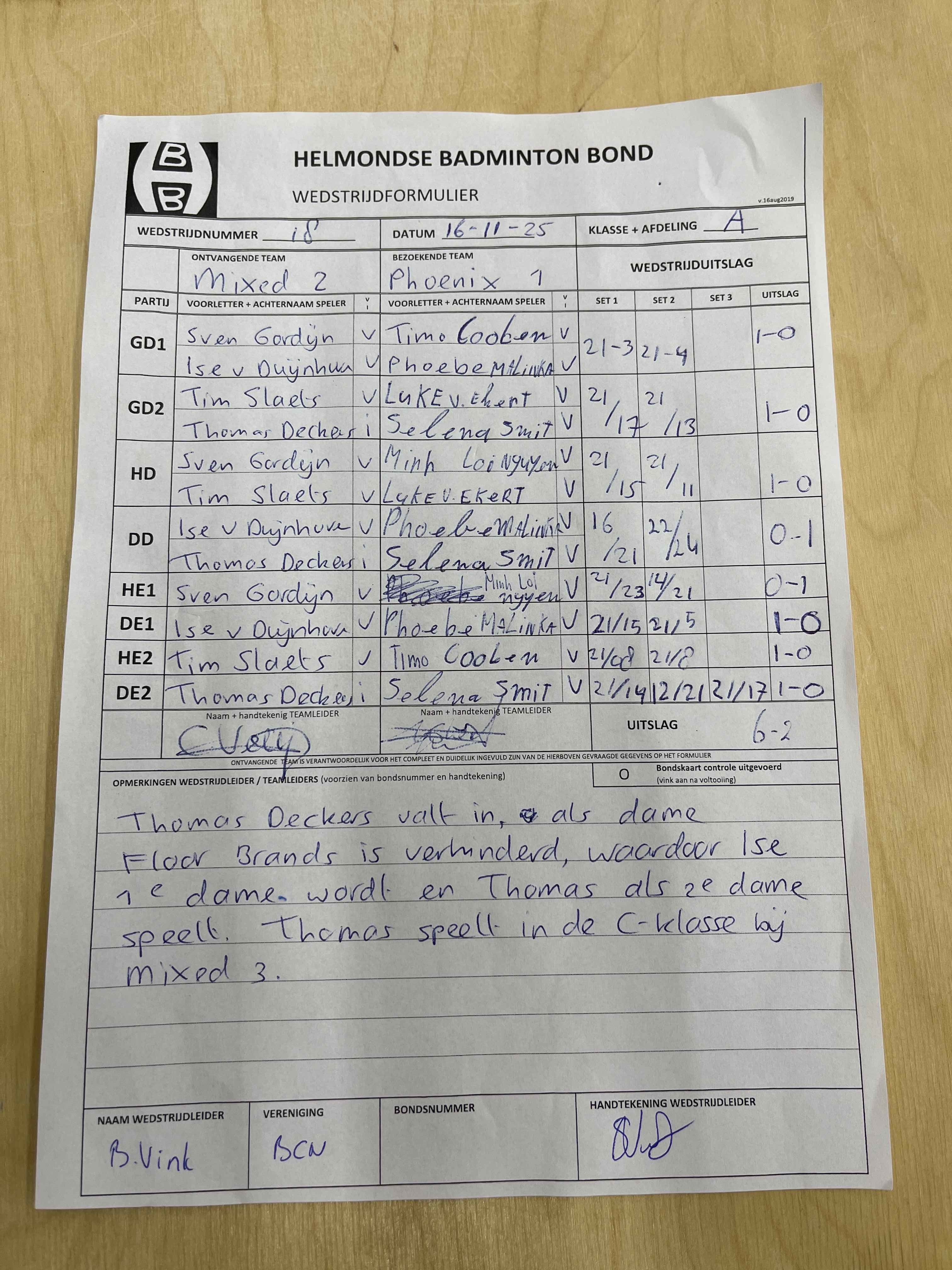 | 12:30 | zo. 16-11-2025 | Mixed 2 | - | Phoenix 1 | 3 | - | ||