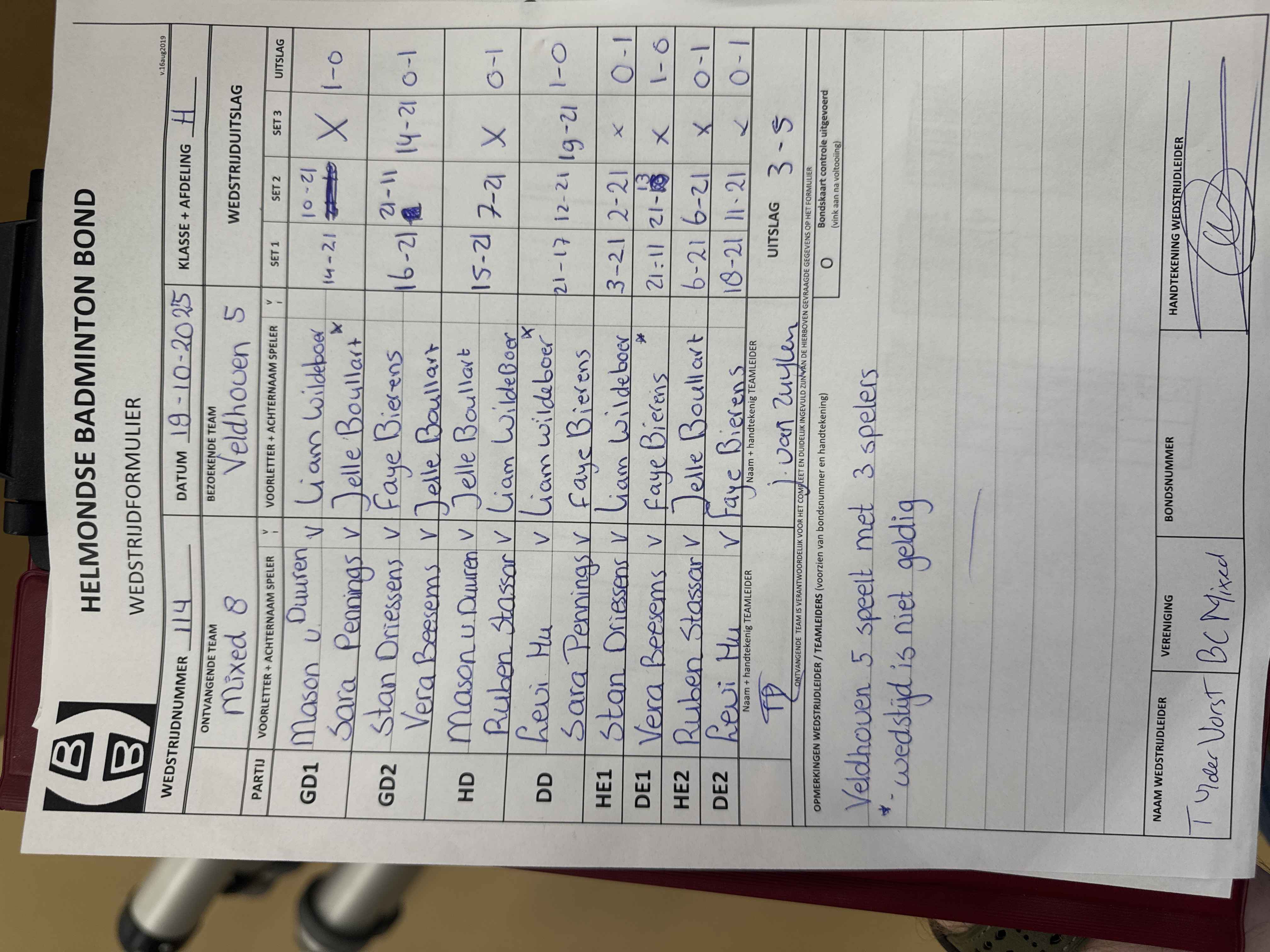 | 09:30 | zo. 19-10-2025 | Mixed 8 | - | Veldhoven 5 | 2 | 3 - 5 | ||