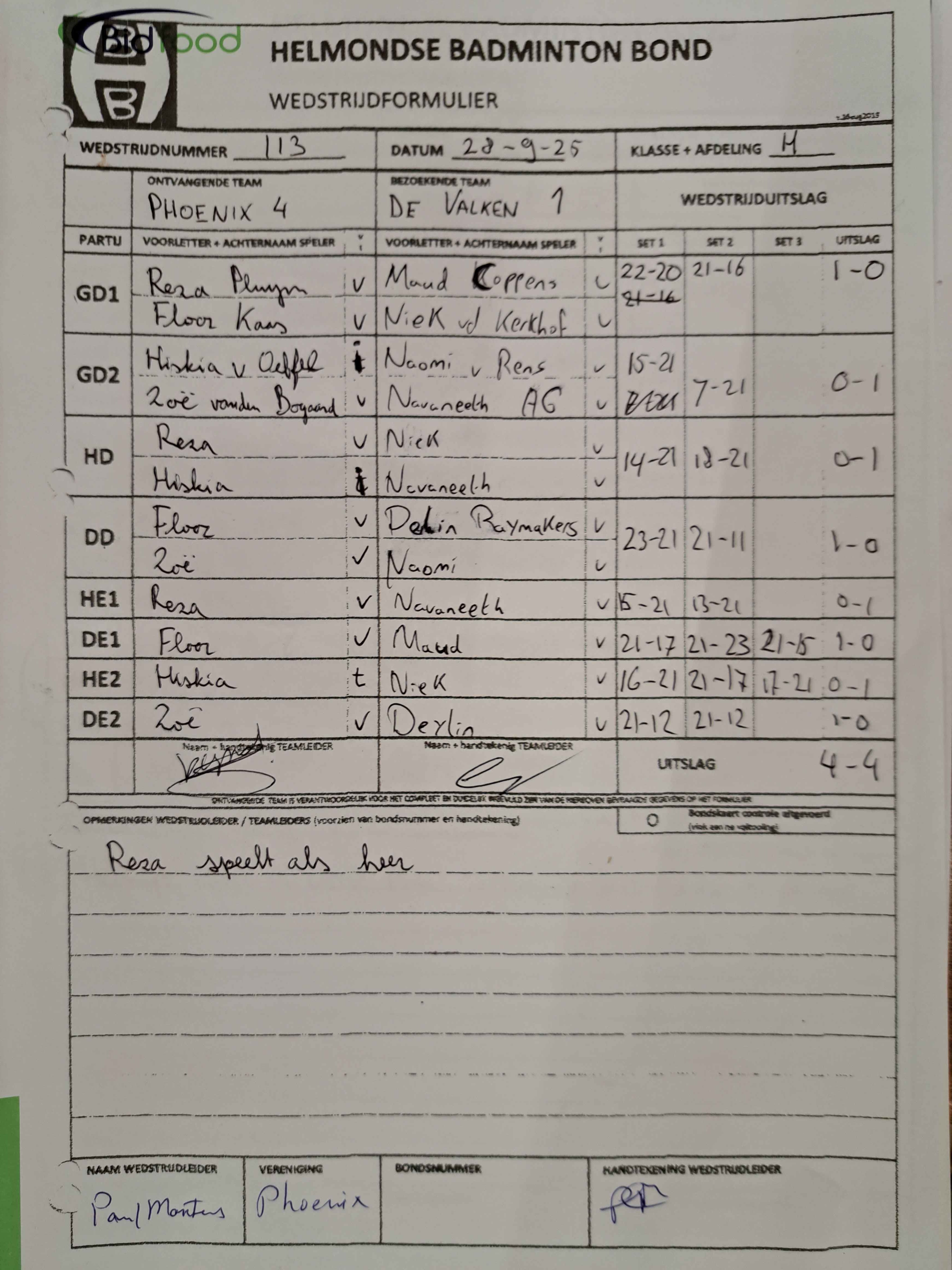 | 12:30 | zo. 28-09-2025 | Phoenix 4 | - | De Valken 1 | 15 | 4 - 4 | ||