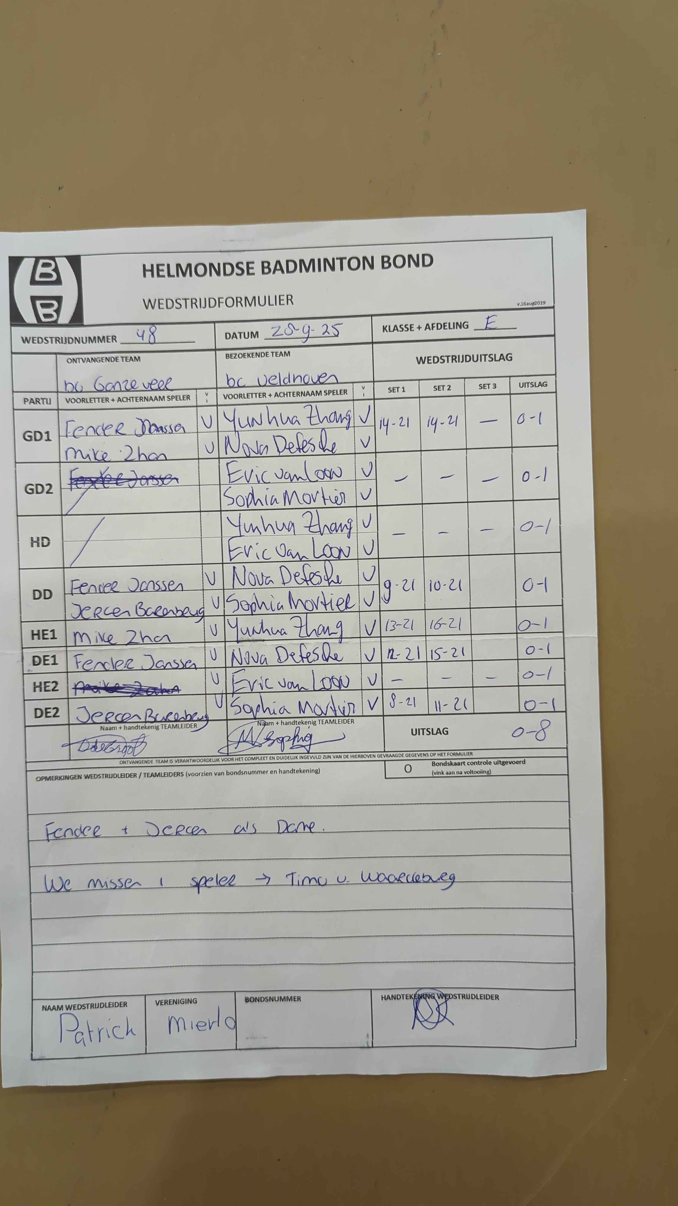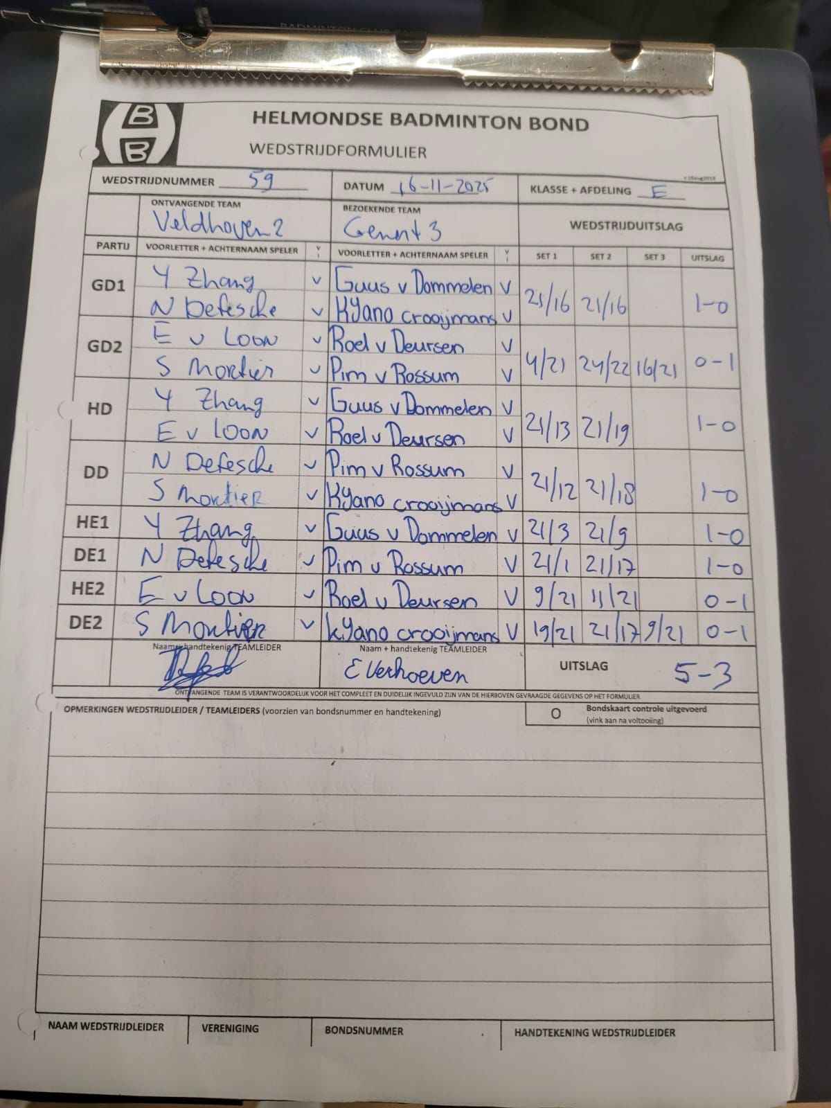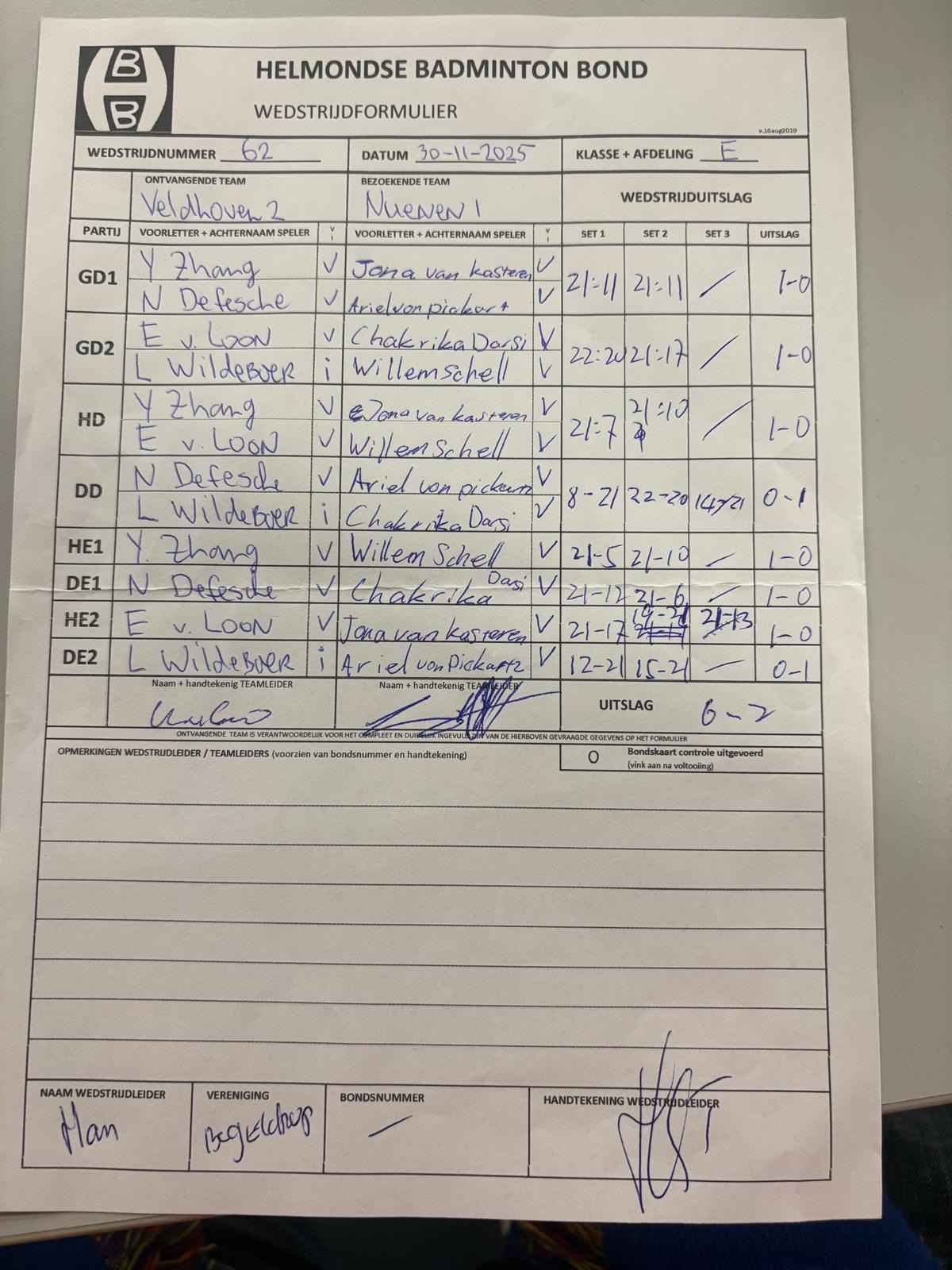 | 12:30 | zo. 09-11-2025 | Mixed 4 | - | Veldhoven 2 | 3 | - | ||
