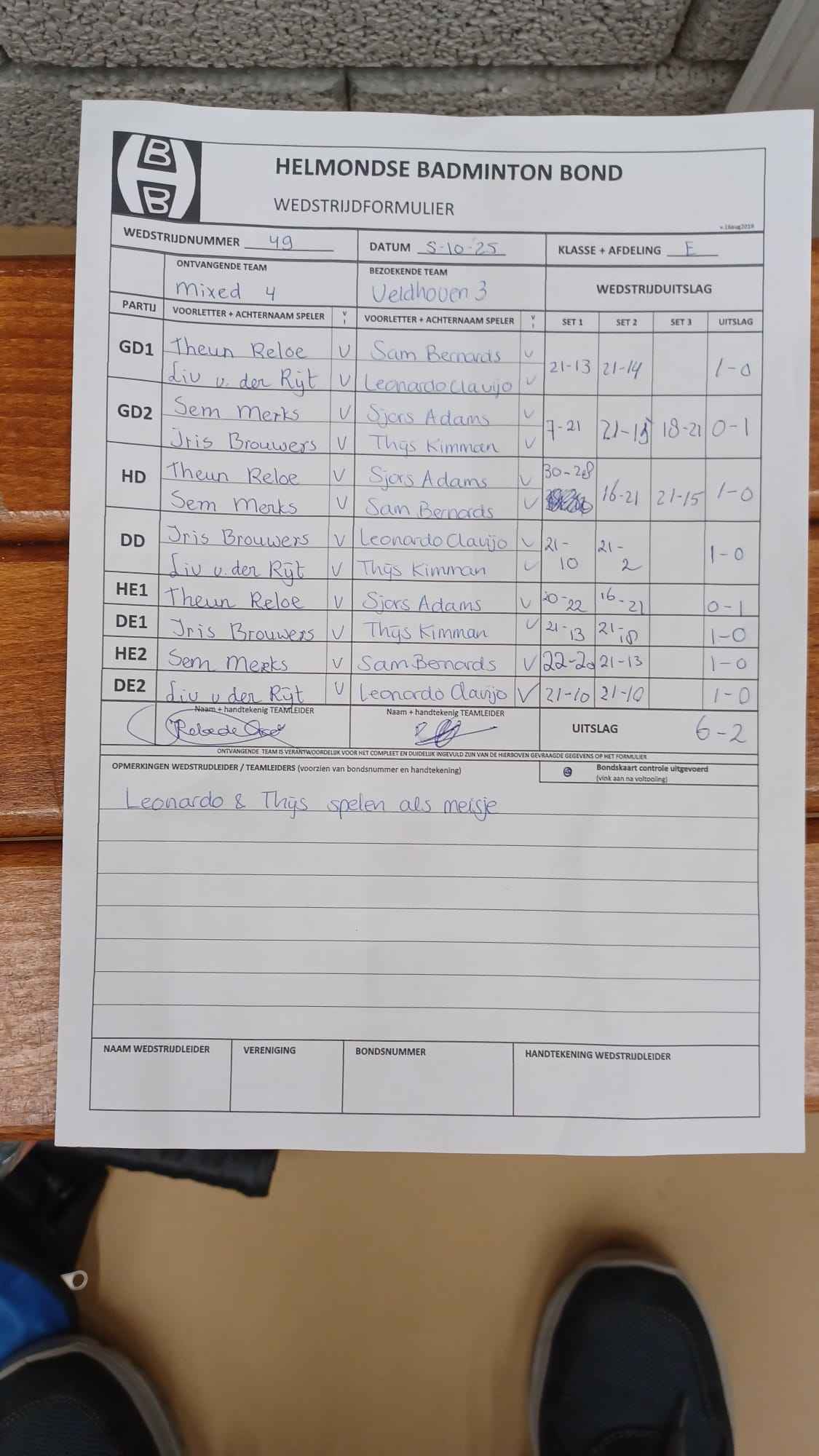 | 09:30 | zo. 05-10-2025 | Mixed 4 | - | Veldhoven 3 | 4 | 6 - 2 | ||