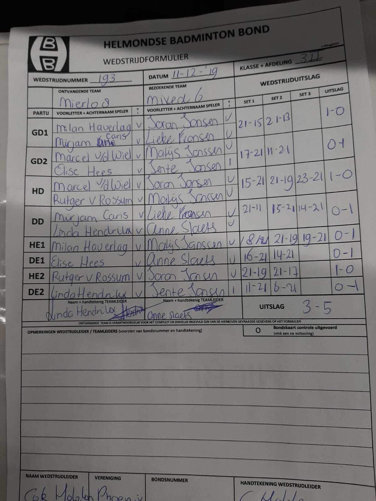 | 193 | wo. 11-12-2019 | Mierlo 8 | - | Mixed 6 | 1 | 3 - 5 | |||