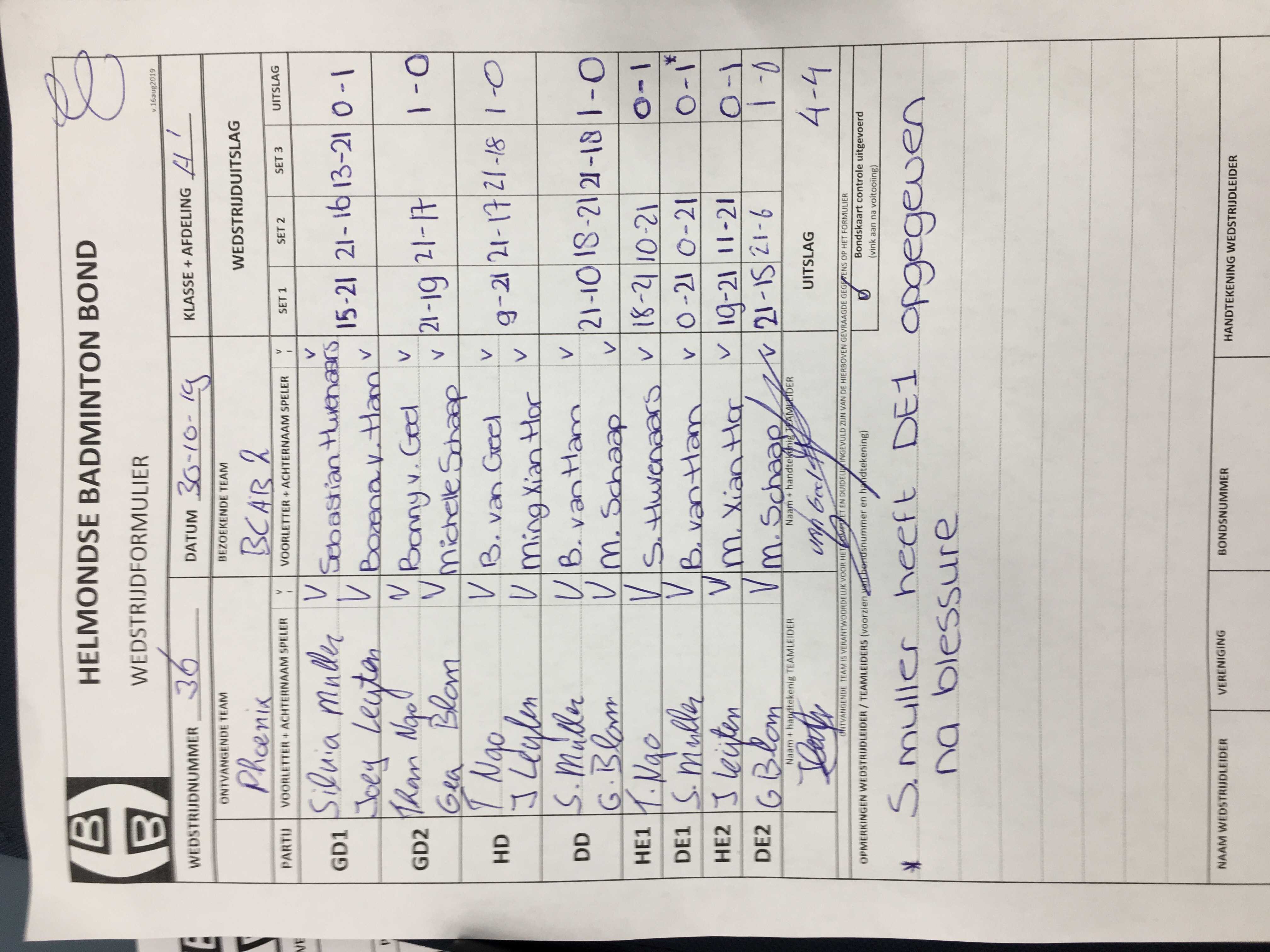 | 36 | wo. 30-10-2019 | Phoenix 1 | - | BCAB 2 | 15 | 4 - 4 | |||