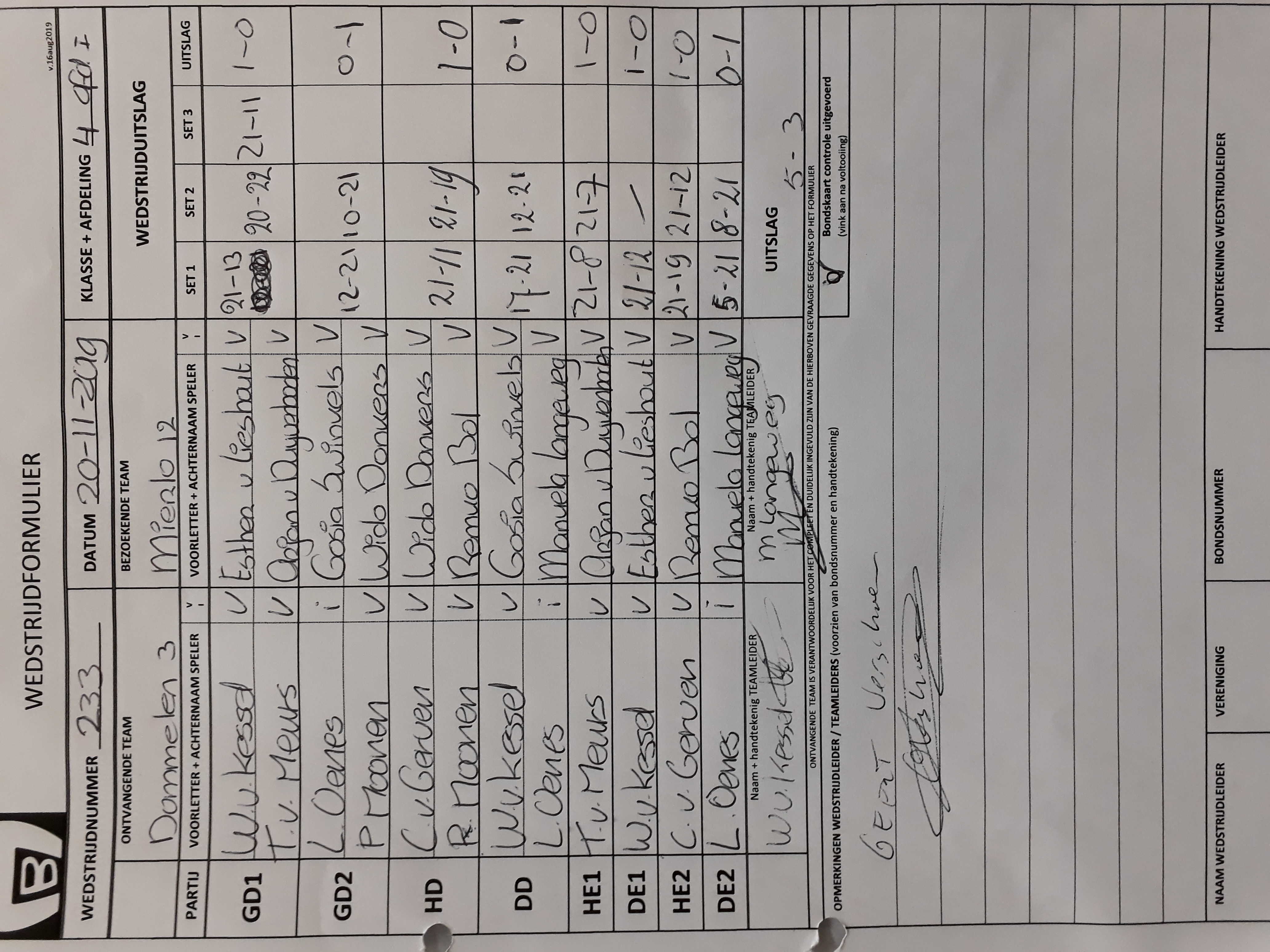 | 233 | wo. 20-11-2019 | Dommelen 3 | - | Mierlo 12 | 14 | 5 - 3 | |||