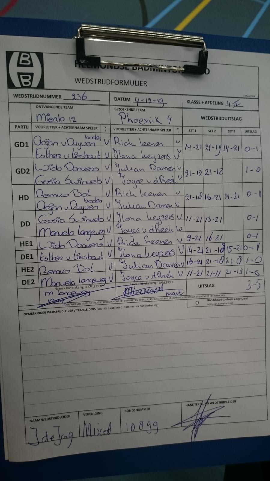| 236 | wo. 04-12-2019 | Mierlo 12 | - | Phoenix 4 | 5 | 3 - 5 | |||