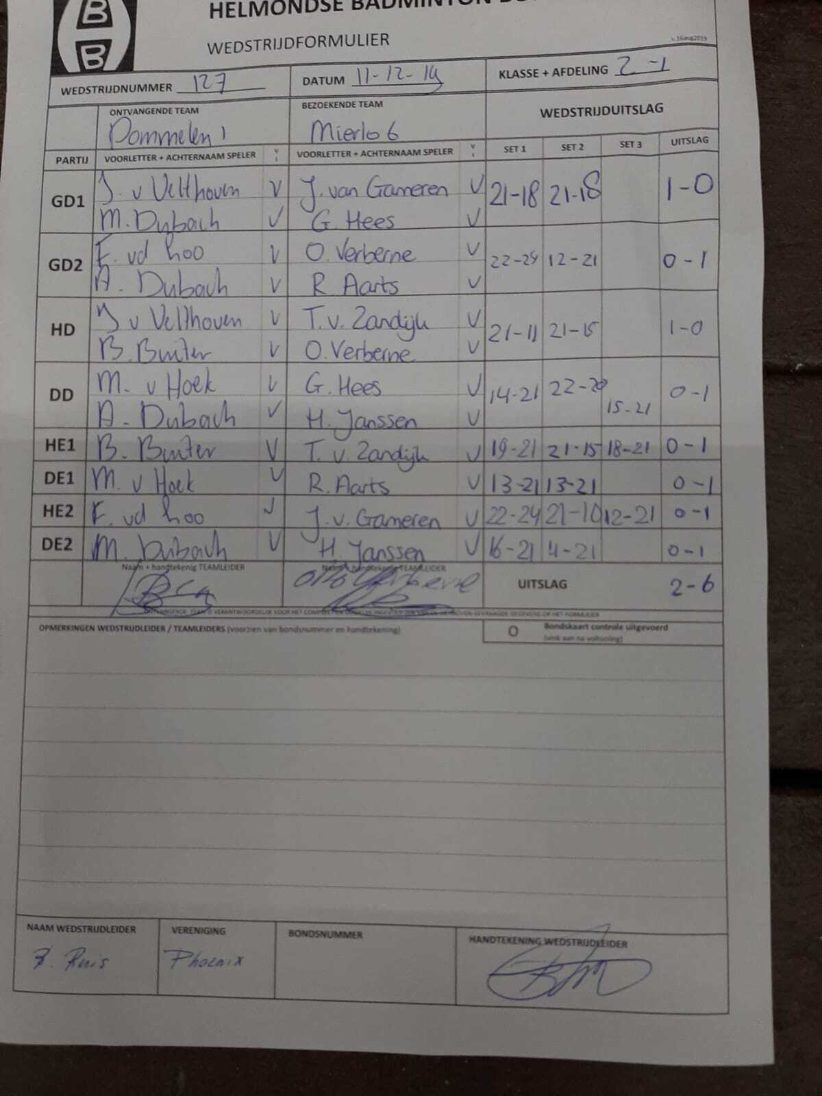 | 127 | wo. 11-12-2019 | Dommelen 1 | - | Mierlo 6 | 11 | 2 - 6 | |||