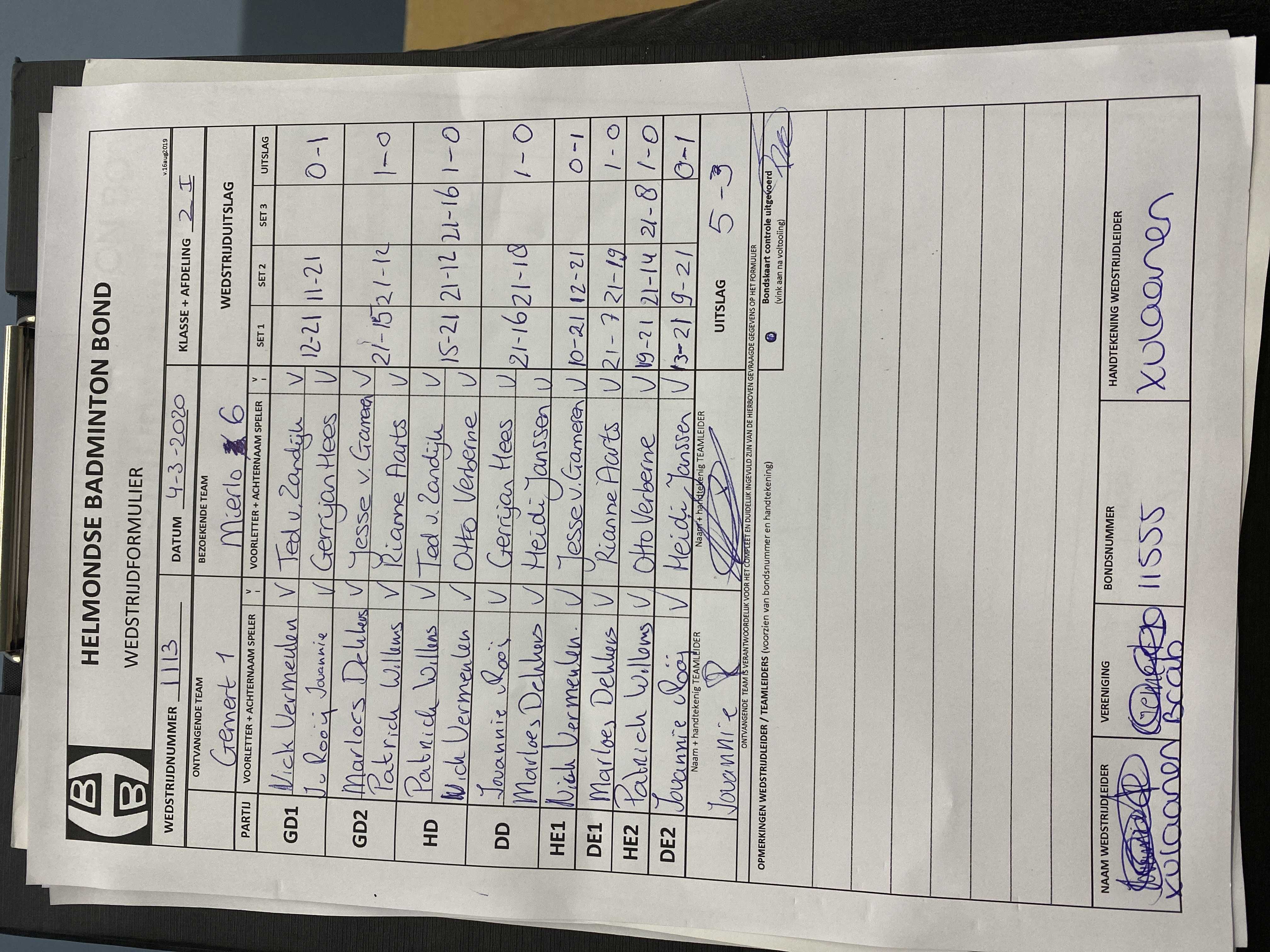 | 1113 | wo. 04-03-2020 | Gemert 1 | - | Mierlo 6 | 14 | 5 - 3 | |||