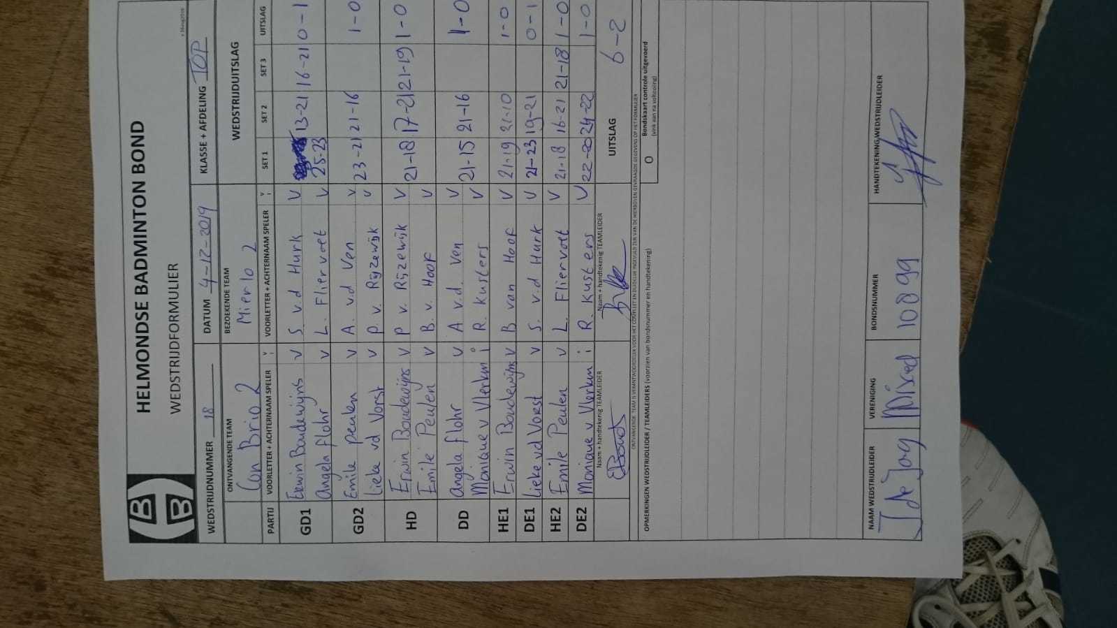 | 18 | wo. 04-12-2019 | Con Brio 2 | - | Mierlo 2 | 13 | 6 - 2 | |||