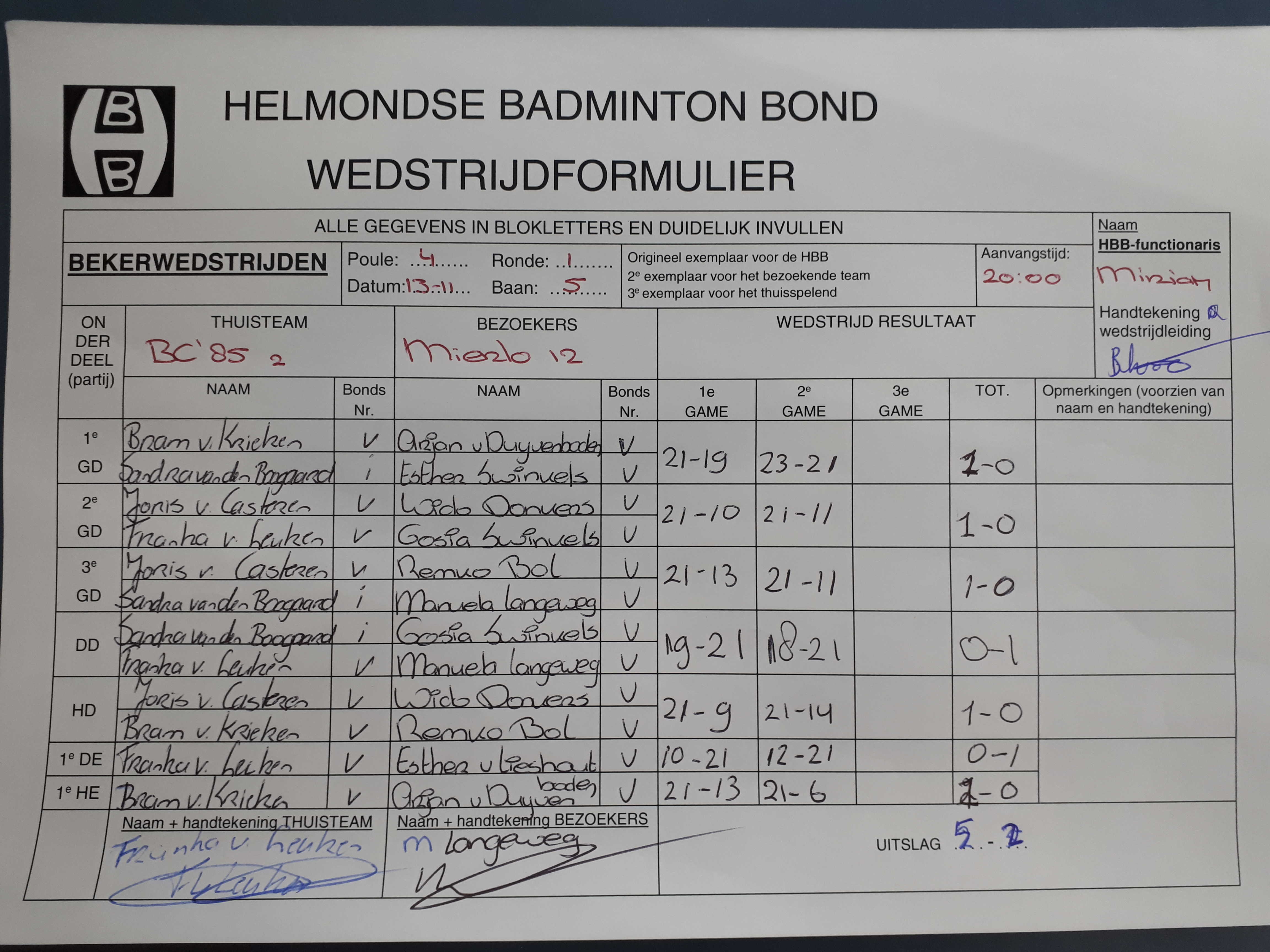 | 3035 | wo. 13-11-2019 | BC '85 2 | - | Mierlo 12 | 5 | 5 - 2 | |||