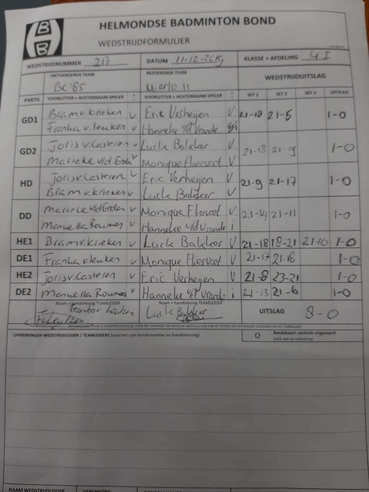 | 217 | wo. 11-12-2019 | BC '85 2 | - | Mierlo 11 | 13 | 8 - 0 | |||