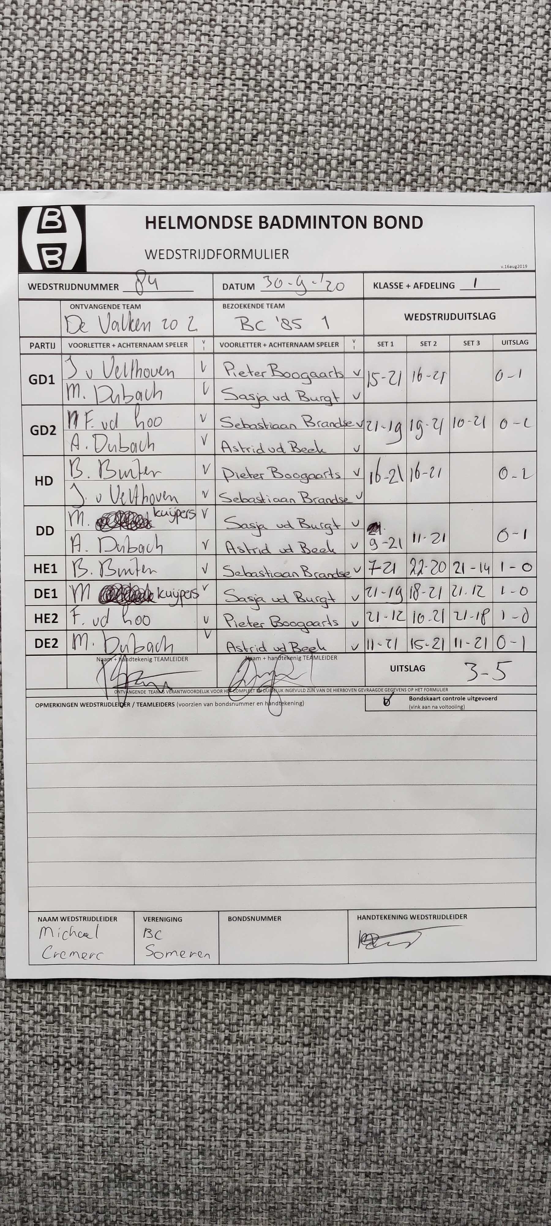 | 84 | wo. 30-09-2020 | De Valken 2 | - | BC '85 1 | 13 | 3 - 5 | |||