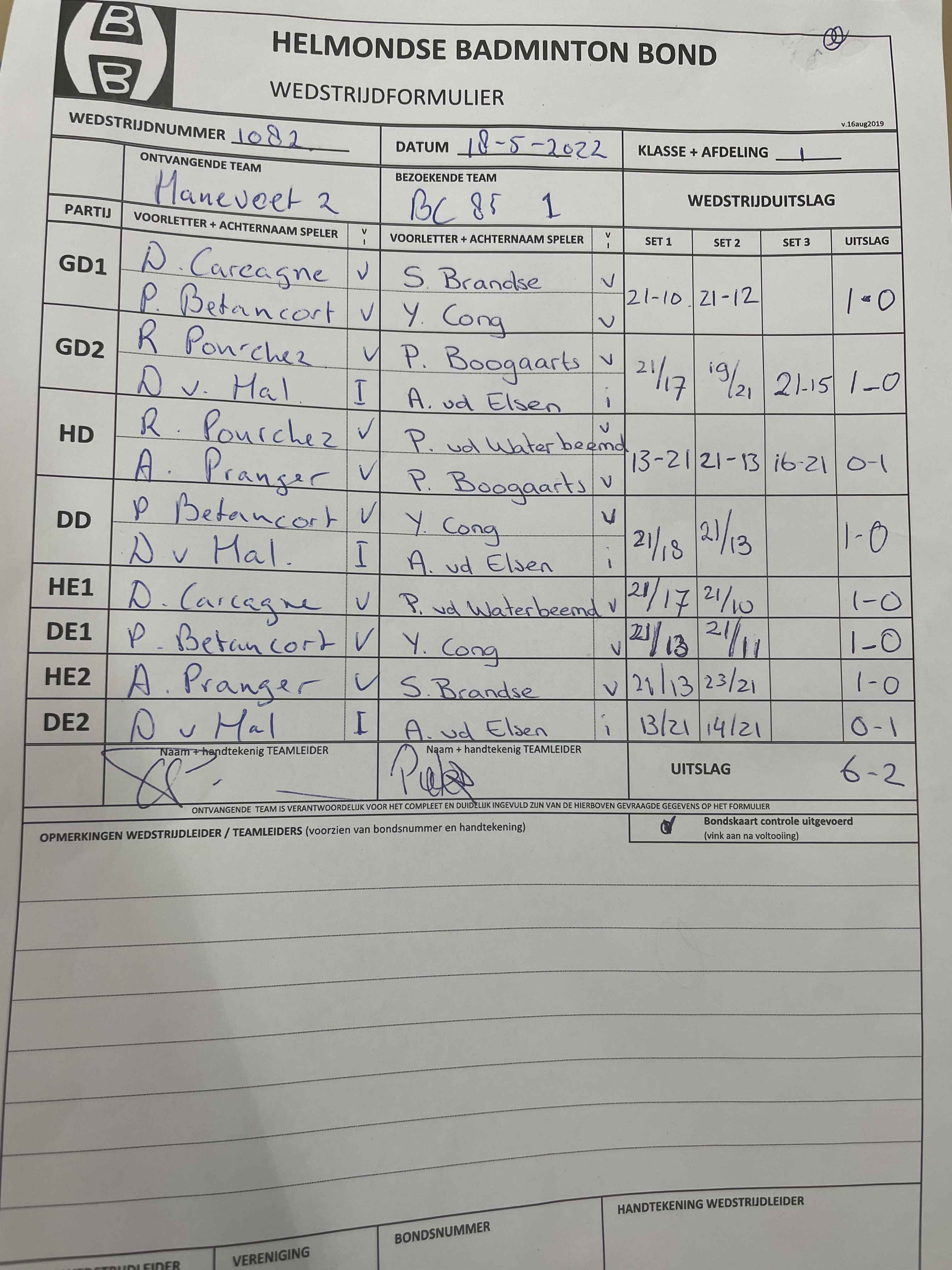 | 1082 | wo. 18-05-2022 | Hanevoet 2 | - | BC '85 1 | 1 | 6 - 2 | |||