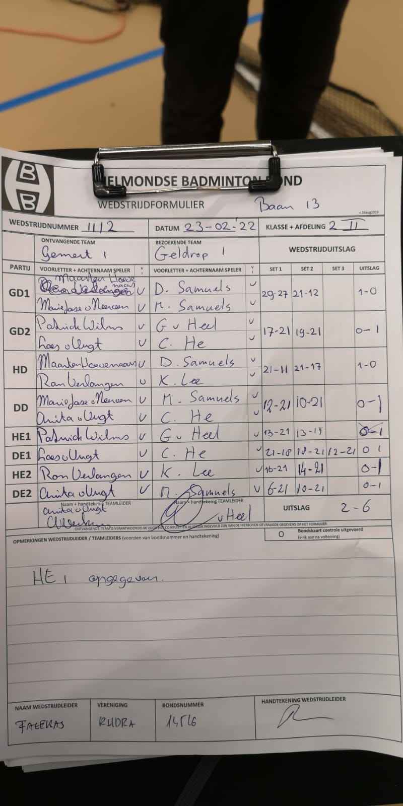 | 1112 | wo. 23-02-2022 | Gemert 1 | - | Geldrop 1 | 13 | 2 - 6 | |||