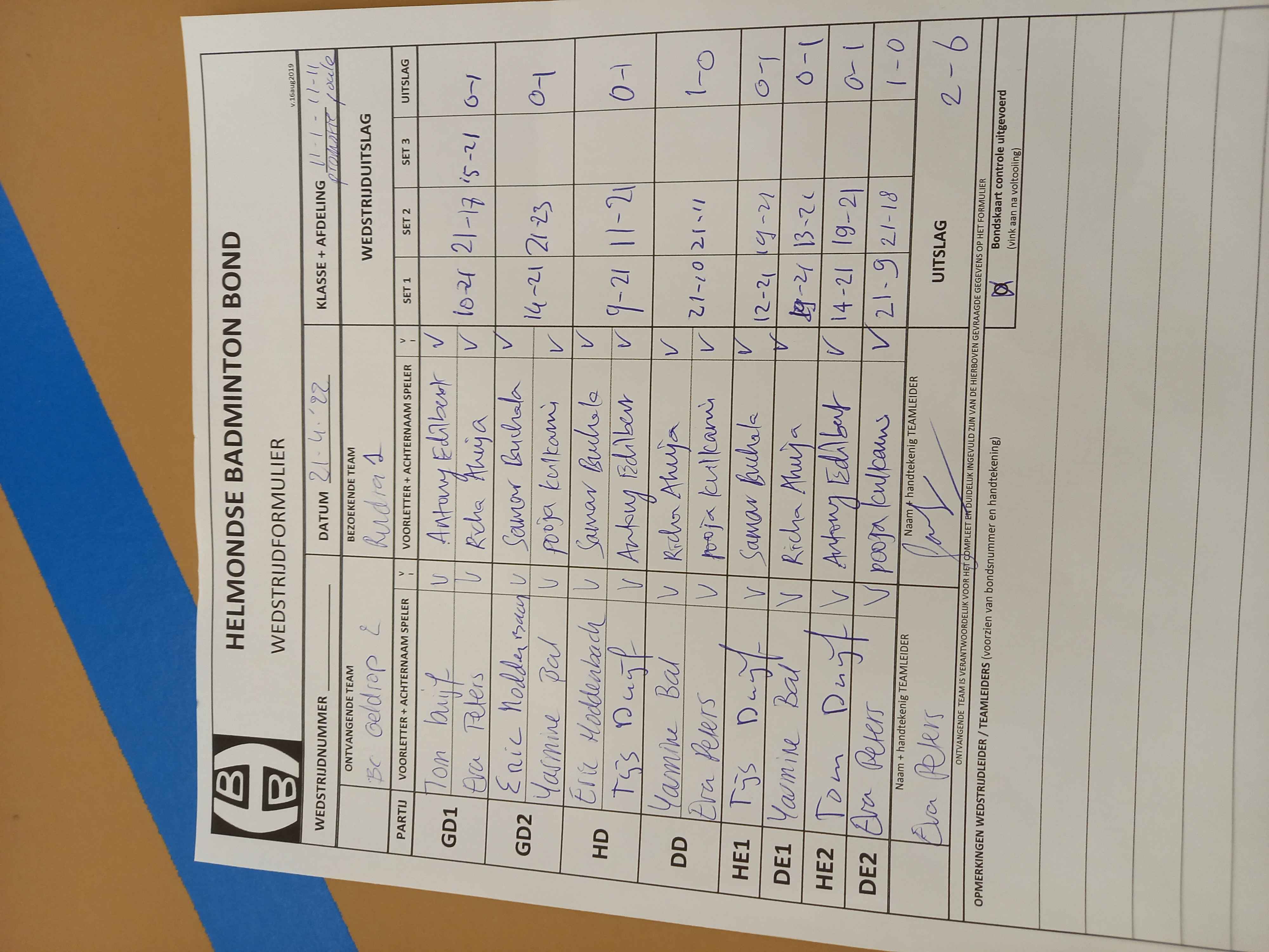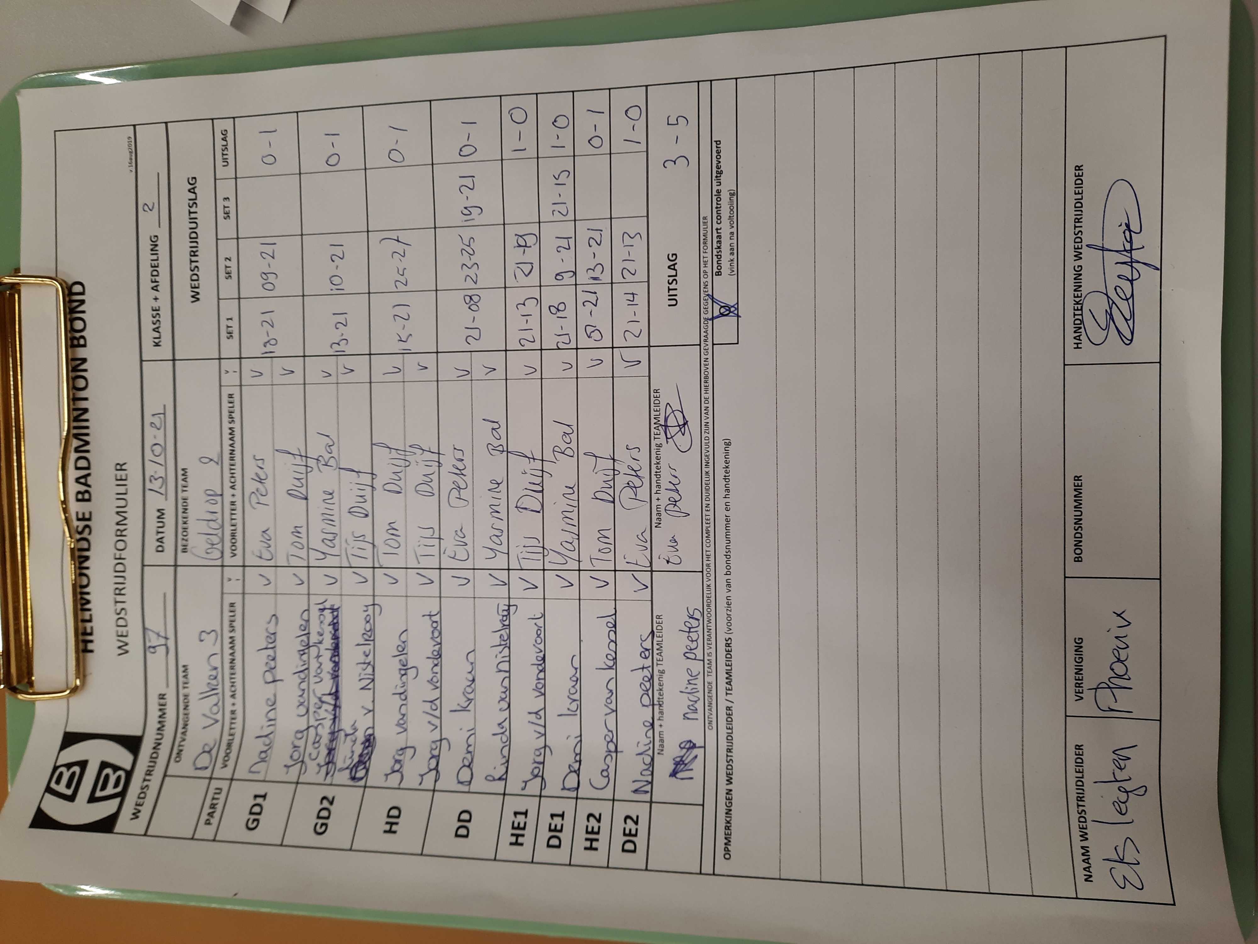 | 99 | wo. 20-10-2021 | Mixed 5 | - | Geldrop 2 | 15 | 5 - 3 | |||