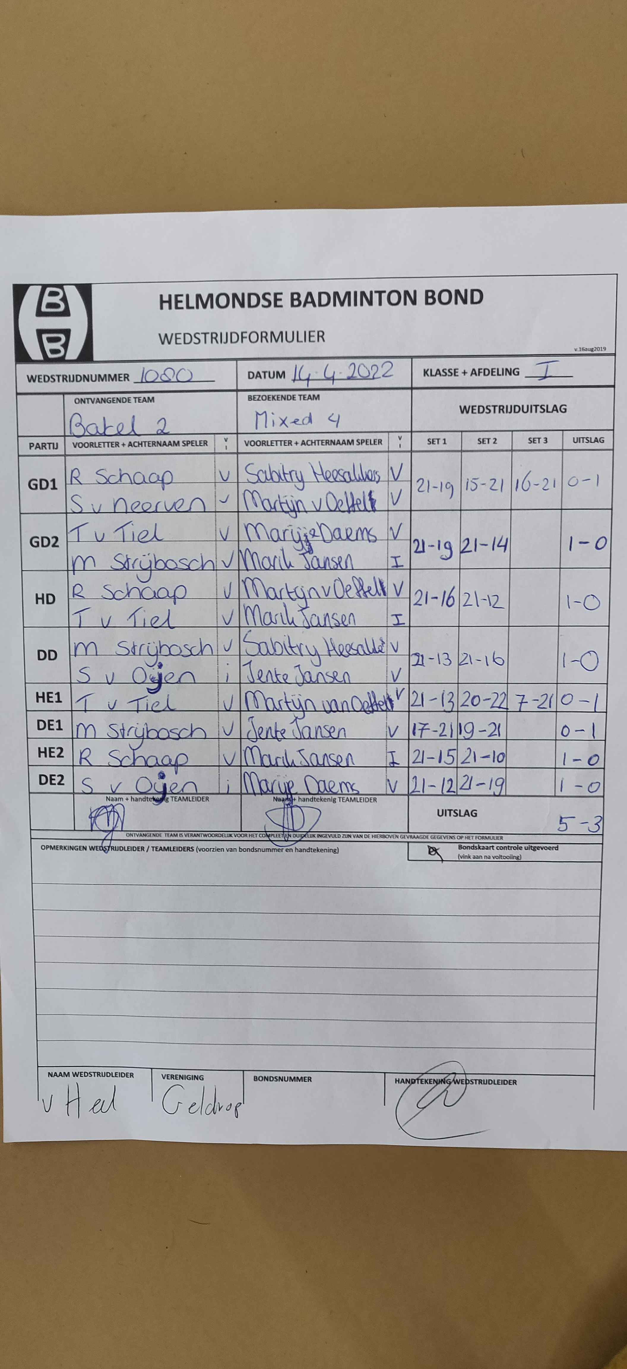 | 1080 | do. 14-04-2022 | Bakel 2 | - | Mixed 4 | 3 | 5 - 3 | |||