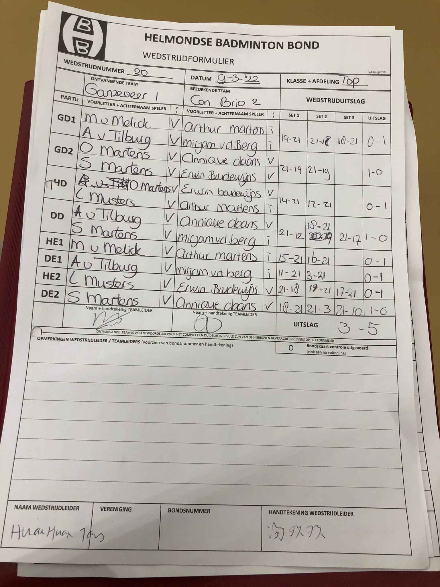 | 20 | wo. 09-03-2022 | Ganzeveer 1 | - | Con Brio 2 | 1 | 3 - 5 | |||