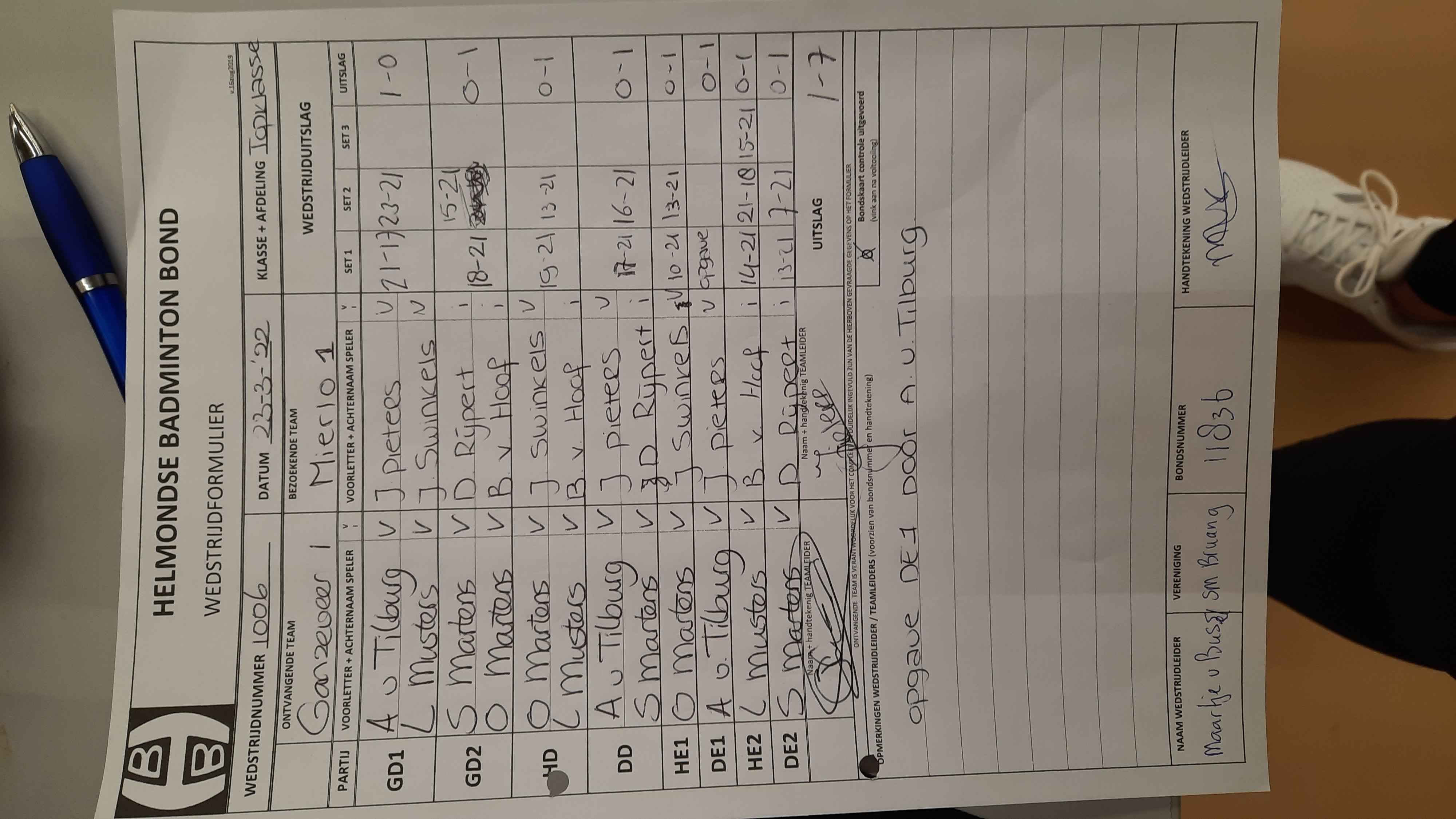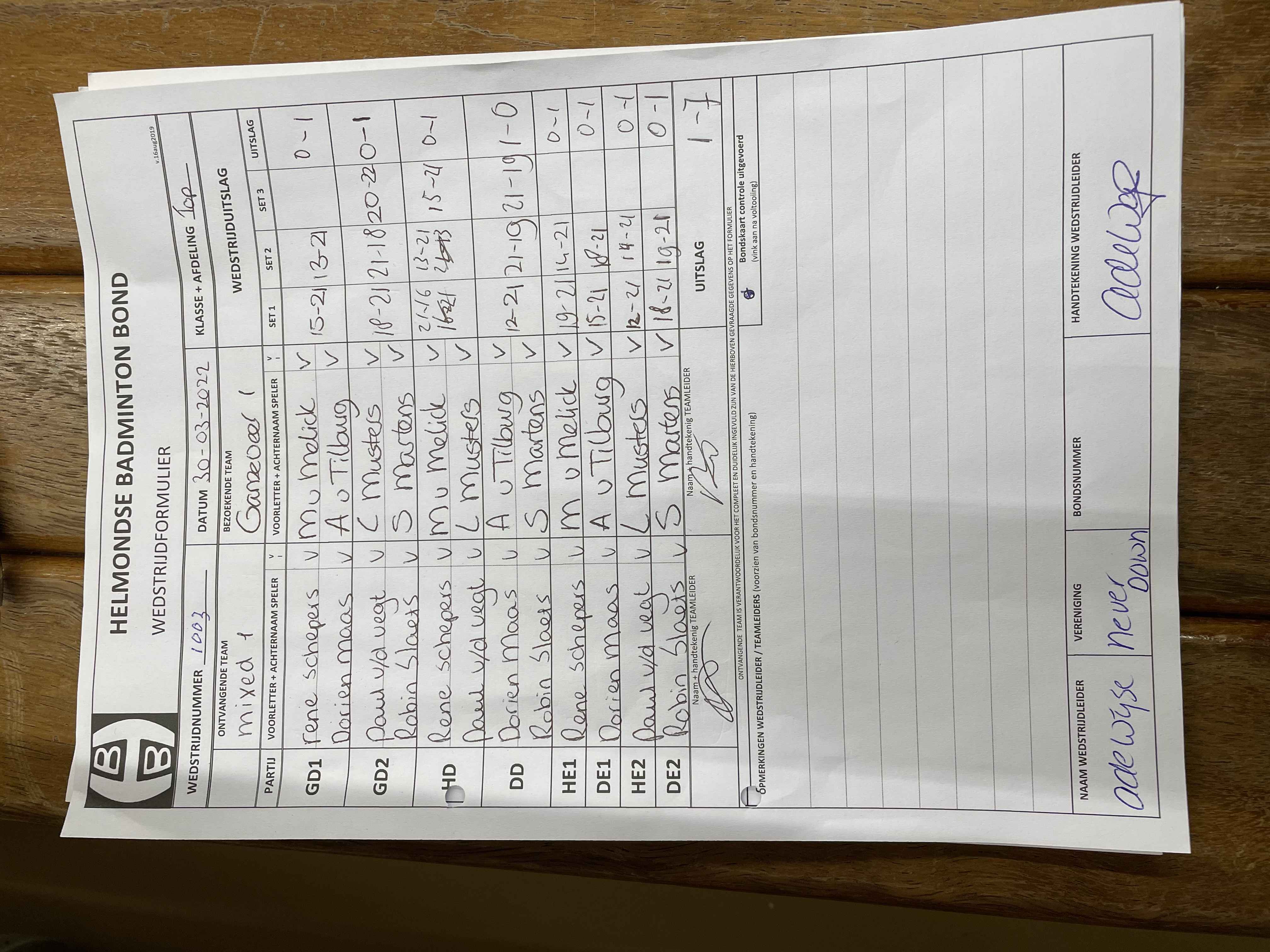 | 1003 | wo. 30-03-2022 | Mixed 1 | - | Ganzeveer 1 | 11 | 1 - 7 | |||