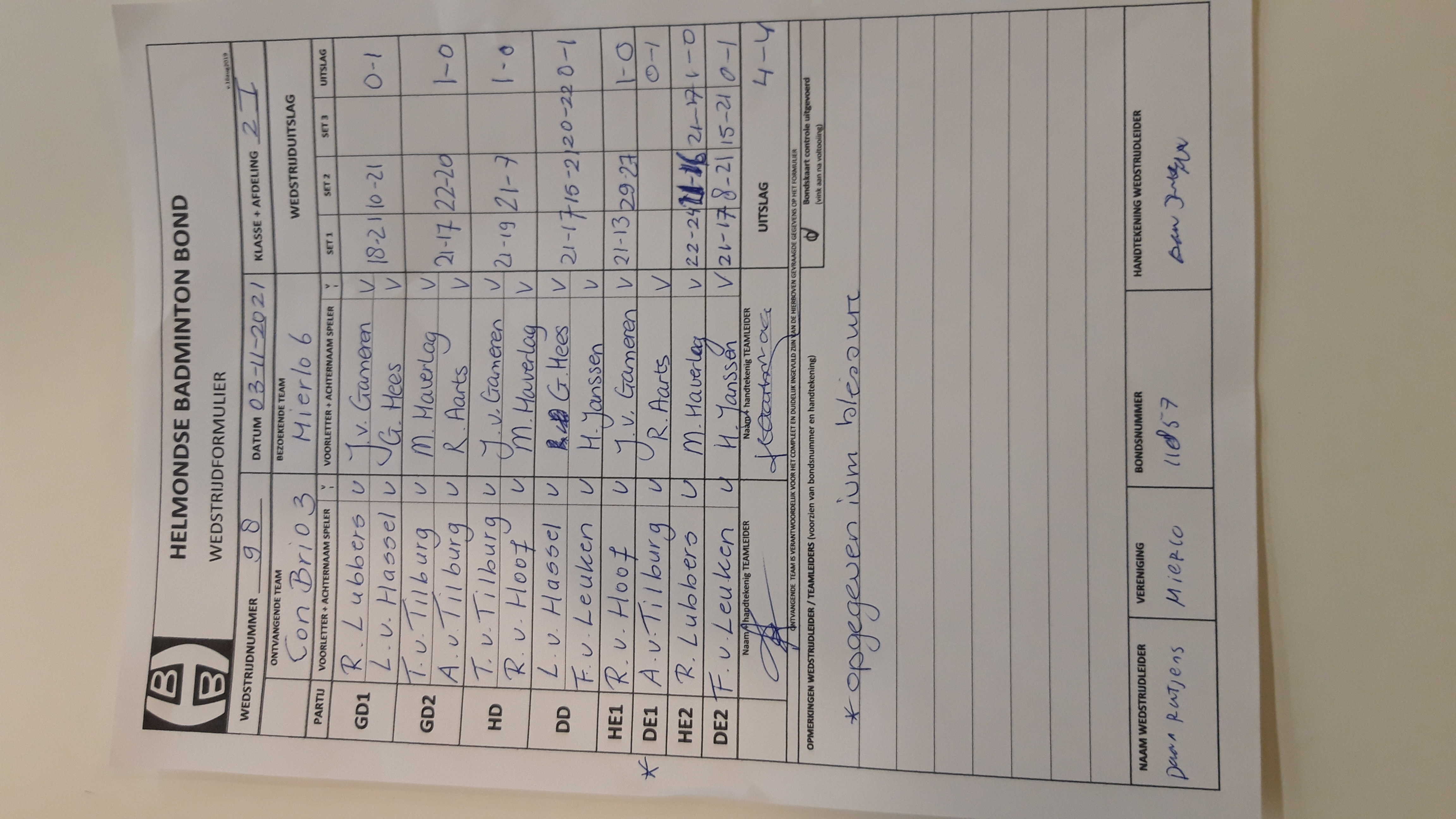| 98 | wo. 03-11-2021 | Con Brio 3 | - | Mierlo 6 | 1 | 4 - 4 | |||