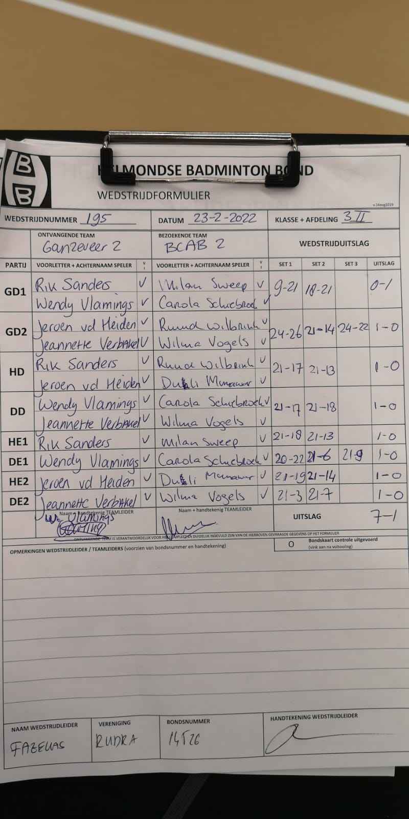 | 195 | wo. 23-02-2022 | Ganzeveer 2 | - | BCAB 2 | 3 | 7 - 1 | |||