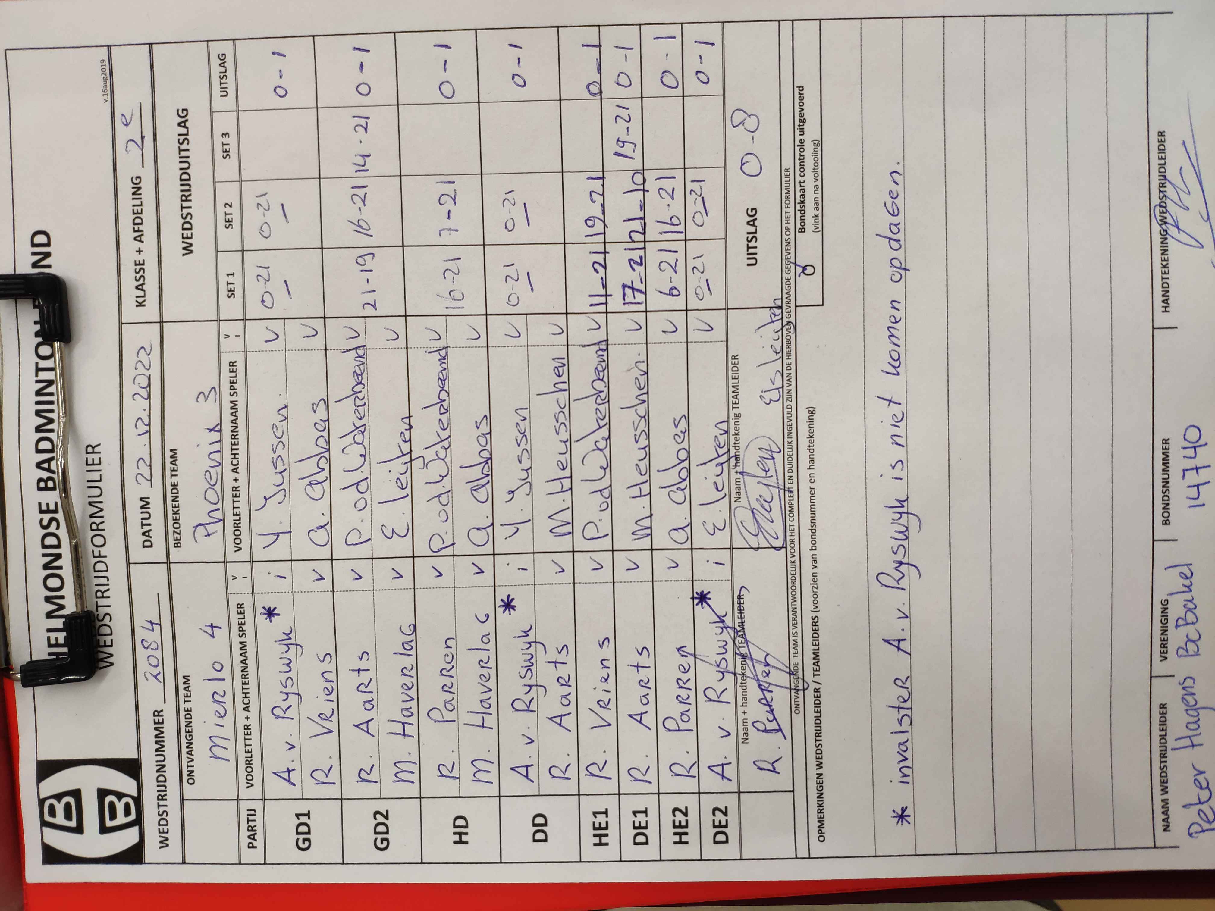| 2084 | do. 22-12-2022 | Mierlo 4 | - | Phoenix 3 | 12 | 0 - 8 | |||