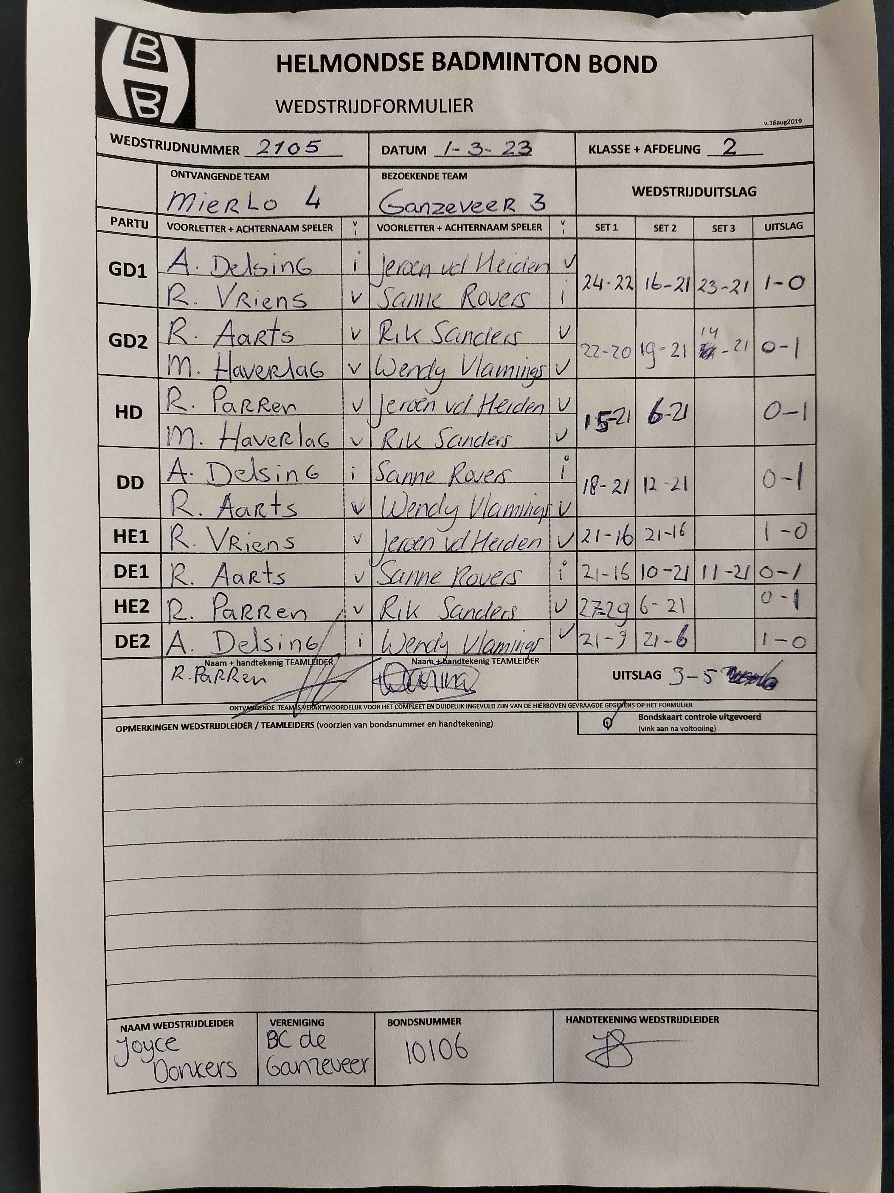 | 2105 | wo. 01-03-2023 | Mierlo 4 | - | Ganzeveer 3 | 4 | 3 - 5 | |||