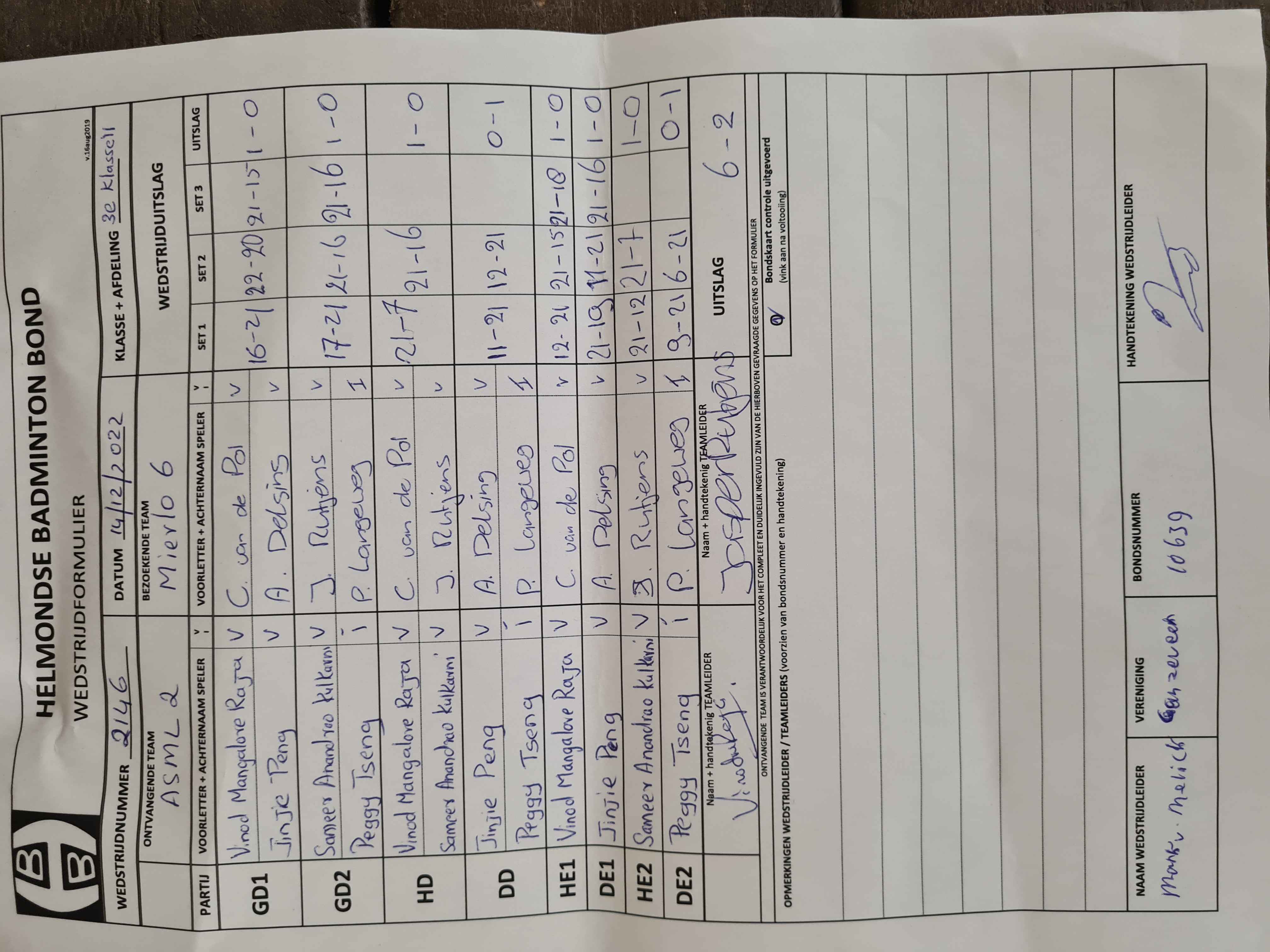 | 2146 | wo. 14-12-2022 | ASML 2 | - | Mierlo 6 | 14 | 6 - 2 | |||