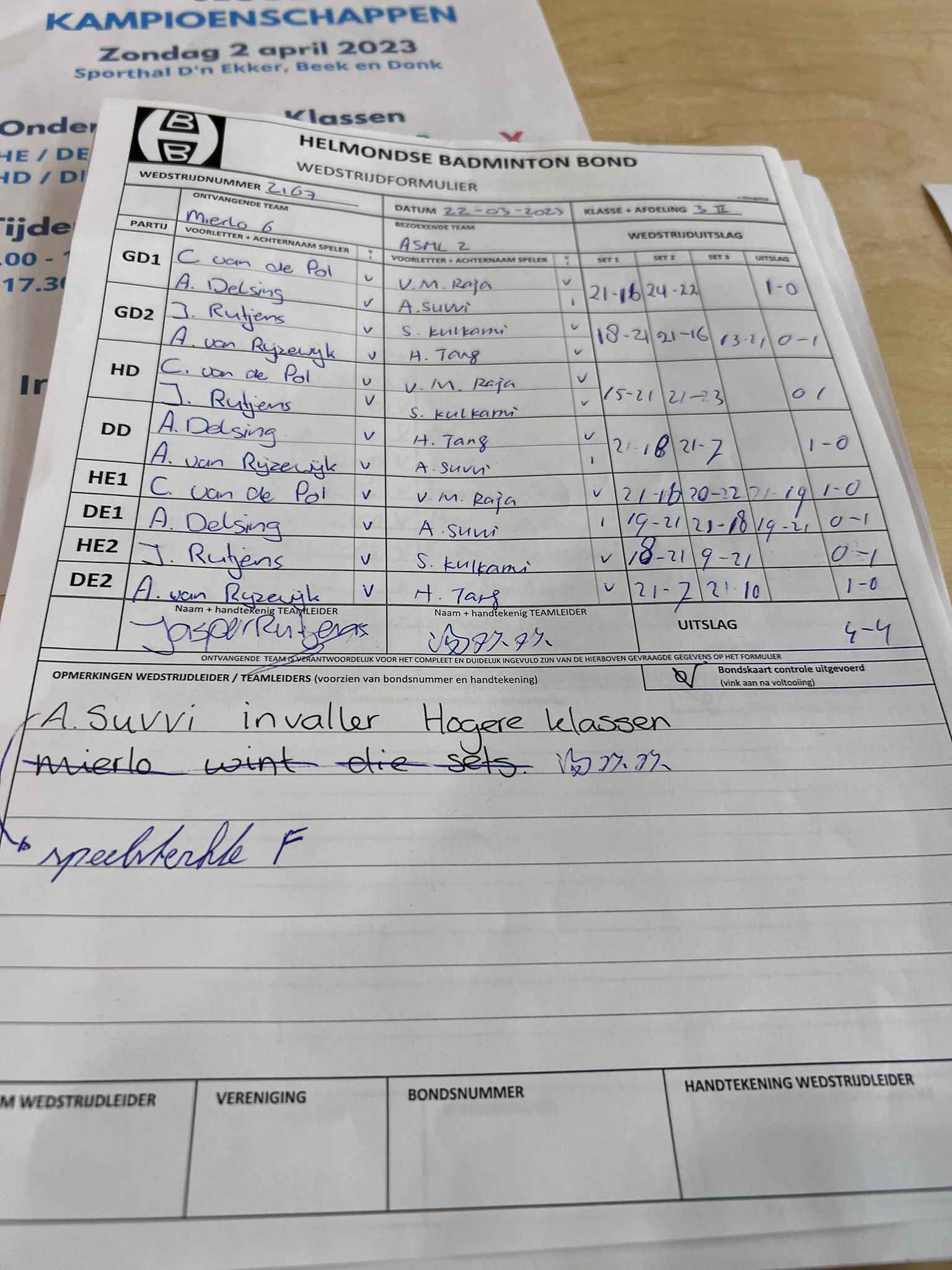| 2167 | wo. 22-03-2023 | Mierlo 6 | - | ASML 2 | 12 | 4 - 4 |