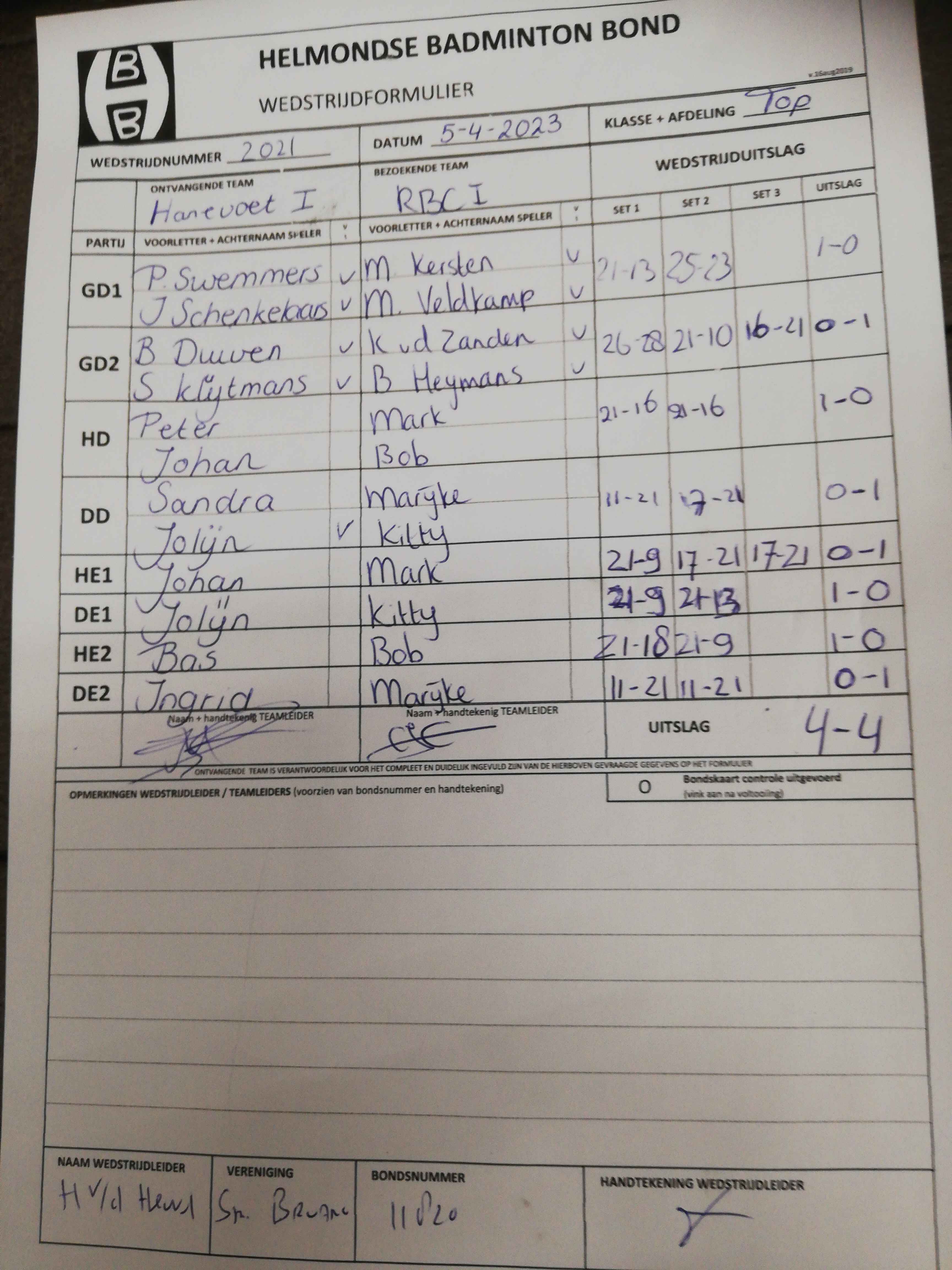 | 2021 | wo. 05-04-2023 | Hanevoet 1 | - | RBC 1 | 2 | 4 - 4 |