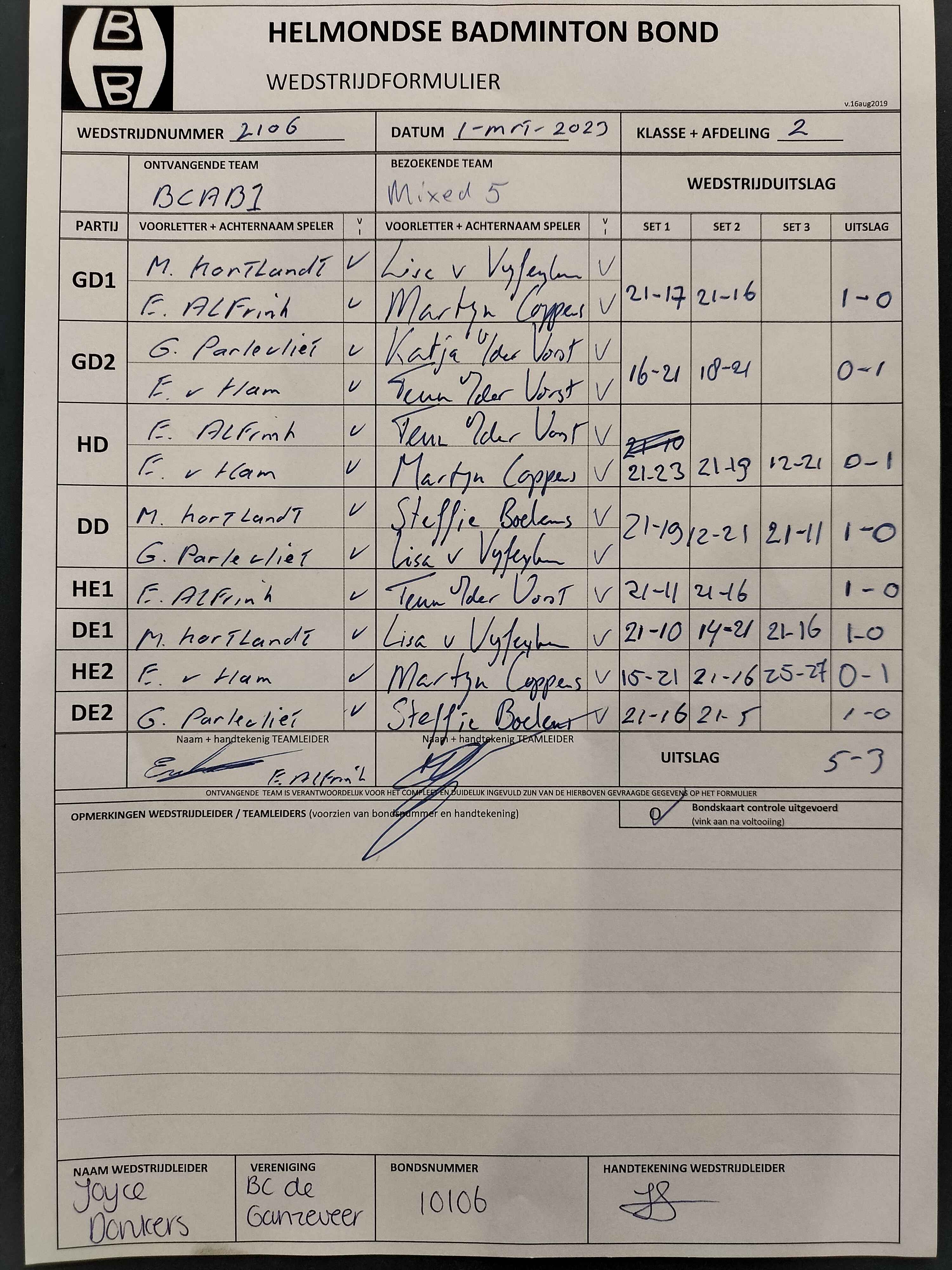| 2106 | wo. 01-03-2023 | BCAB 1 | - | Mixed 5 | 11 | 5 - 3 | |||