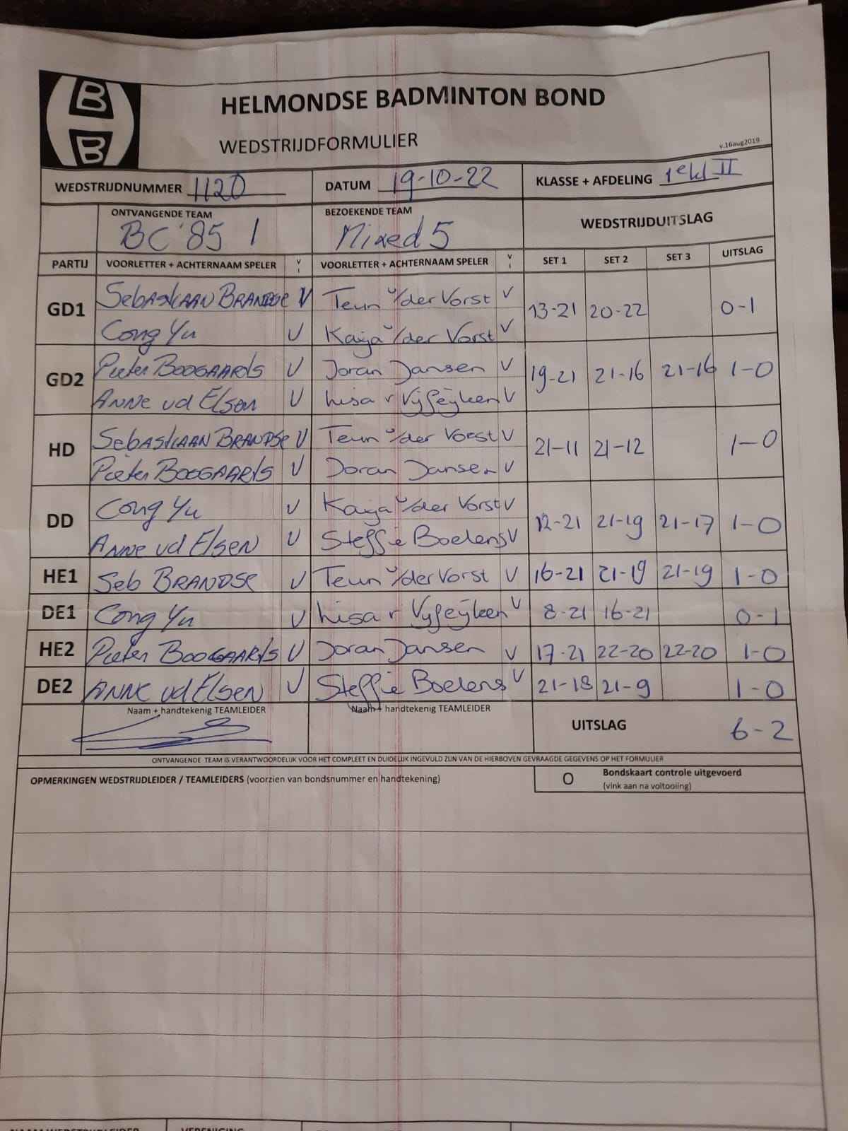 | 1120 | wo. 19-10-2022 | BC '85 1 | - | Mixed 5 | 2 | 6 - 2 | |||