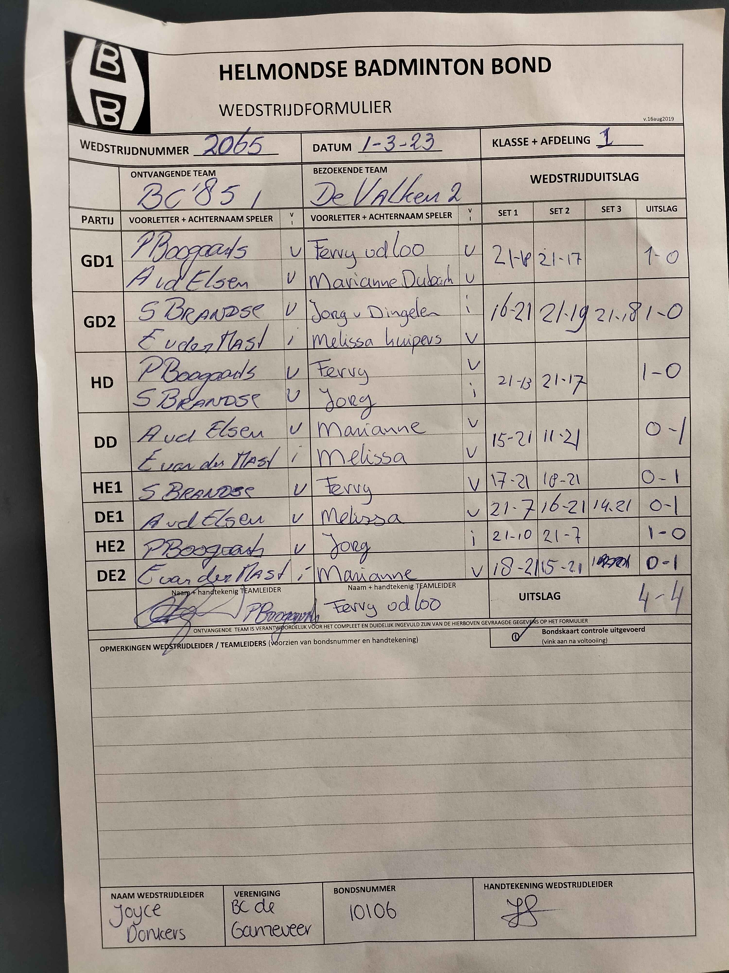 | 2065 | wo. 01-03-2023 | BC '85 1 | - | De Valken 2 | 15 | 4 - 4 | |||