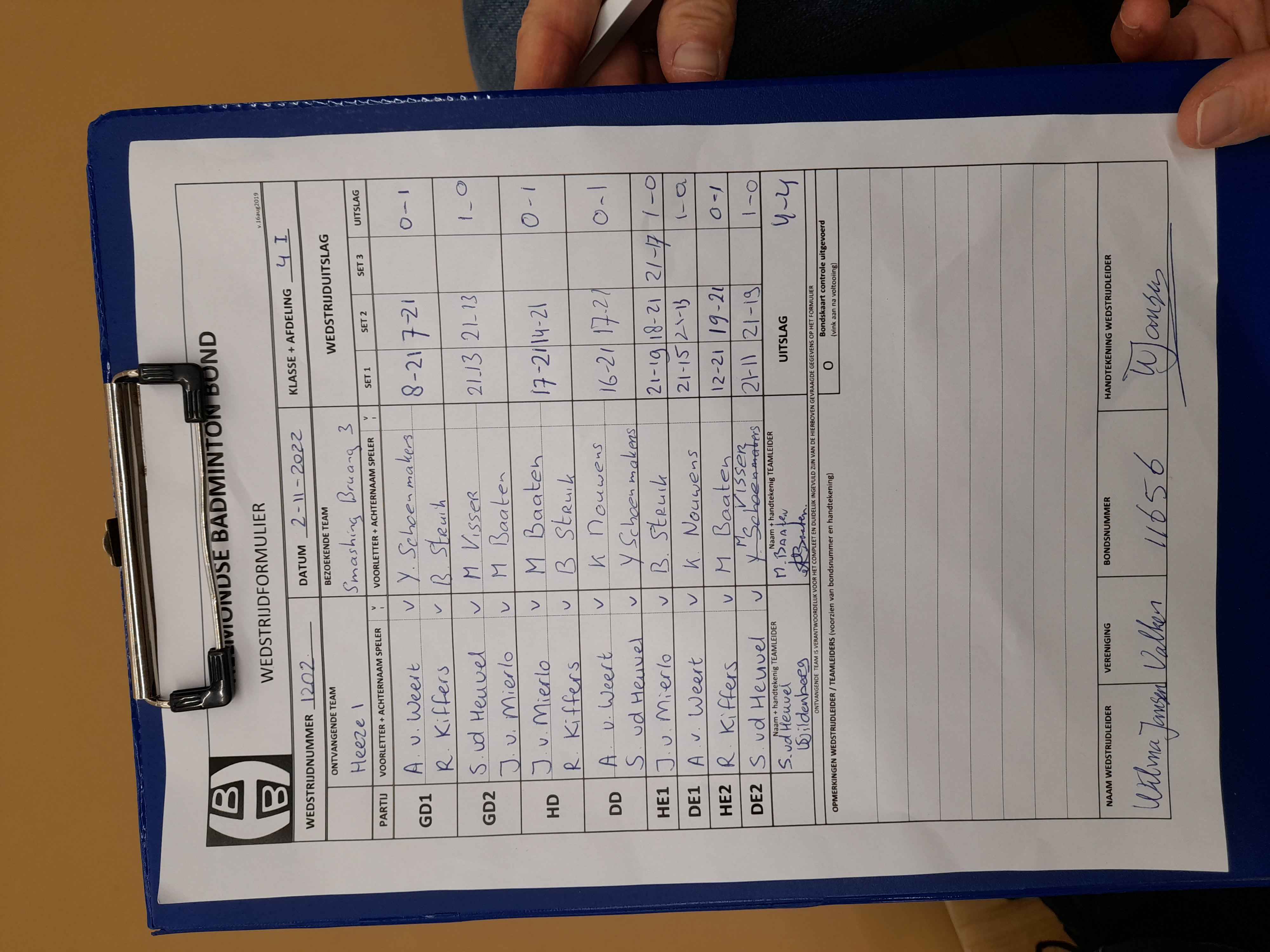 | 1202 | wo. 02-11-2022 | Heeze 1 | - | Smashing Bruang 3 | 14 | 4 - 4 | |||