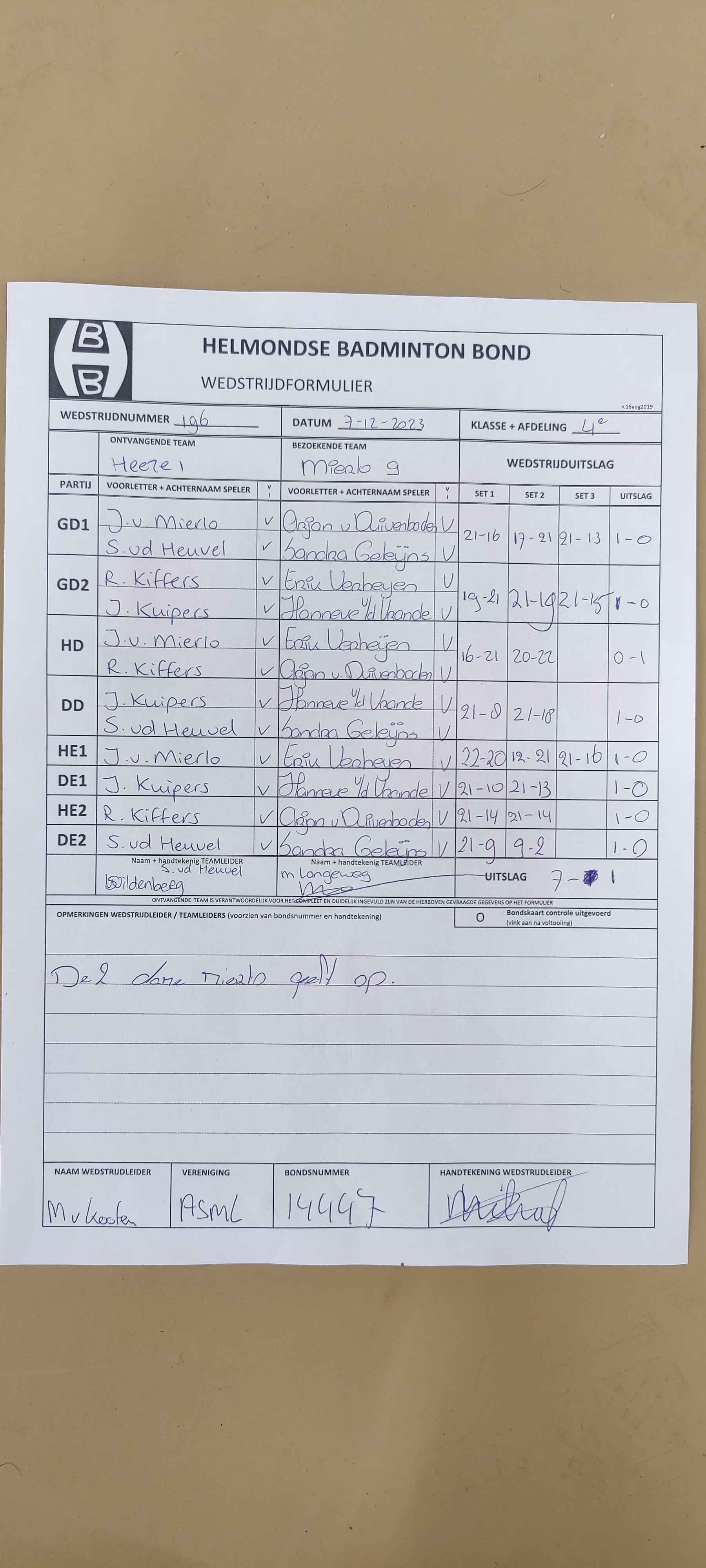 | 196 | do. 07-12-2023 | Heeze 1 | - | Mierlo 9 | 11 | 7 - 1 | |||