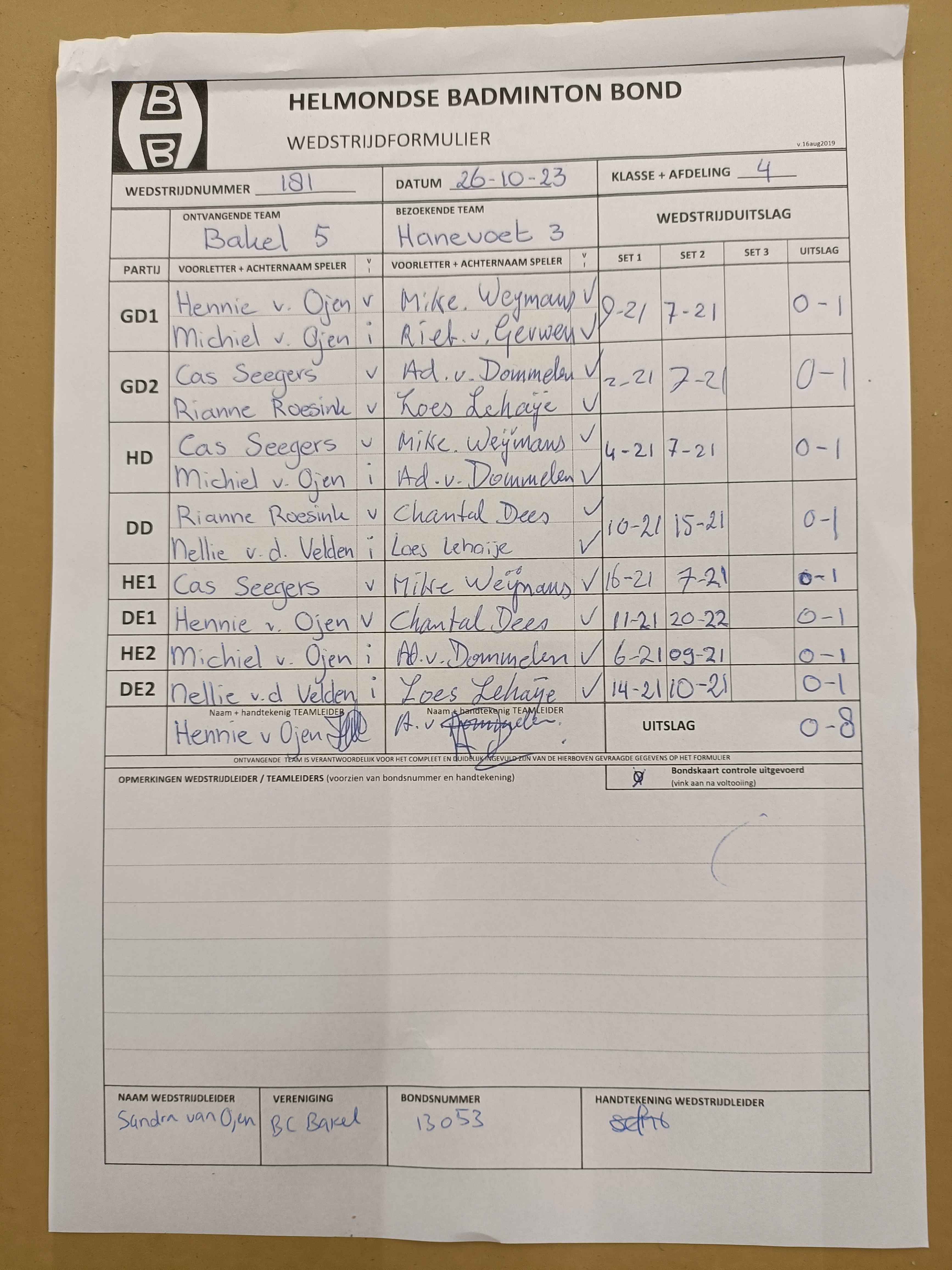 | 181 | do. 26-10-2023 | Bakel 5 | - | Hanevoet 3 | 12 | 0 - 8 | |||