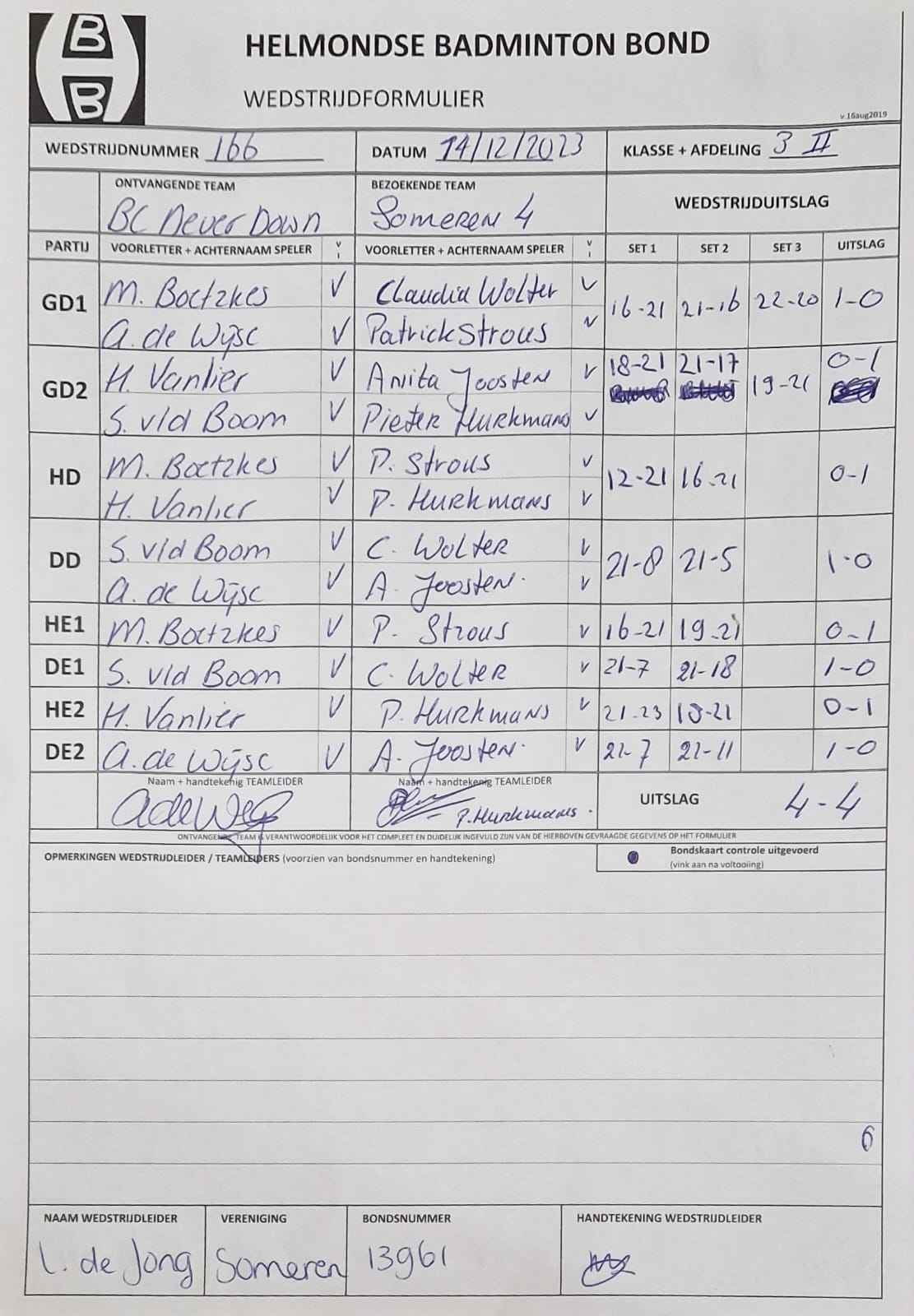 | 166 | do. 14-12-2023 | Never Down 1 | - | Someren 4 | 12 | 4 - 4 | |||